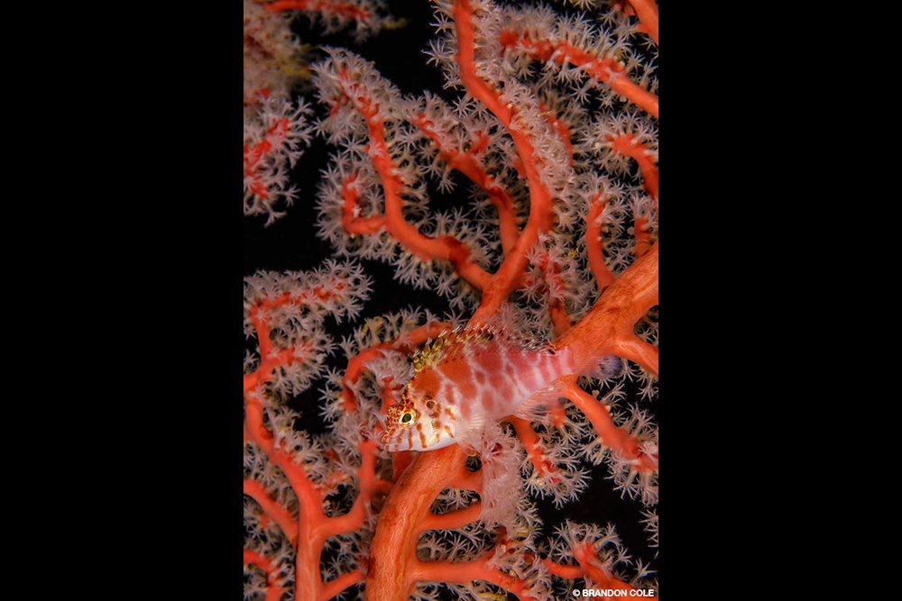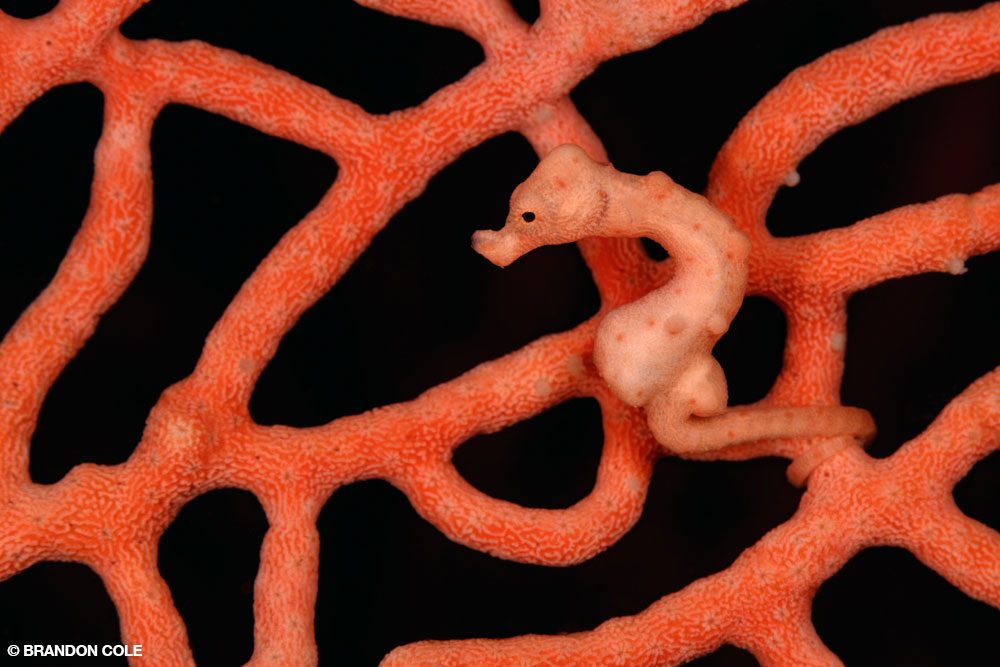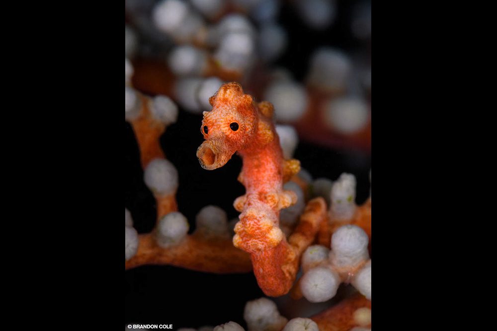 With momentum building, we moved farther down the shelving reef to an obliging orange Denise’s pygmy seahorse and one of its Santa Claus variants living on a carmine-colored gorgonian at a depth of 55 feet. Sporting whitish bumps on its red body, this thumbnail-sized seahorse cruised about its domain, jerkily jumping through the tentacle forest from one blue-and-white polyp perch to the next.