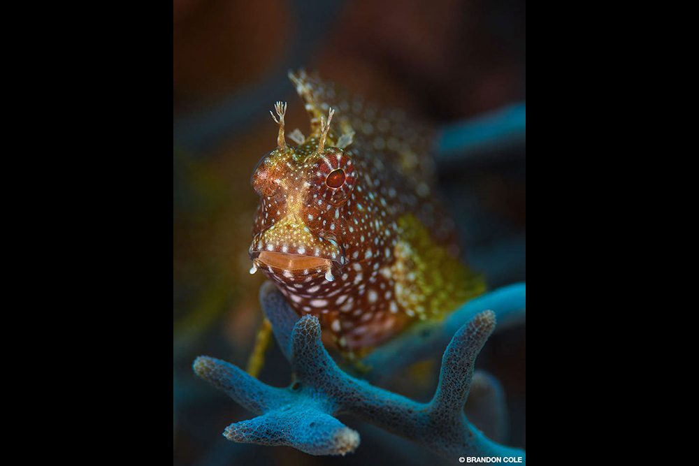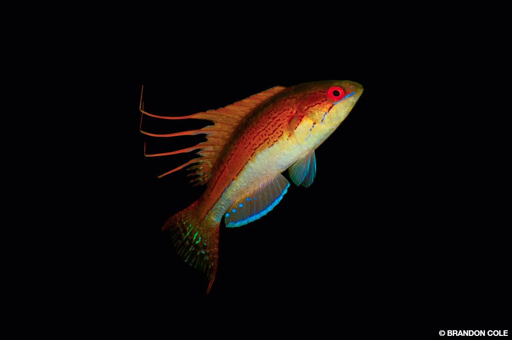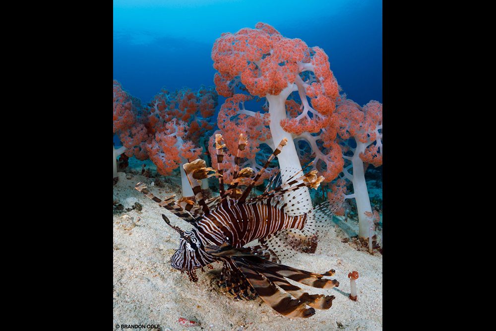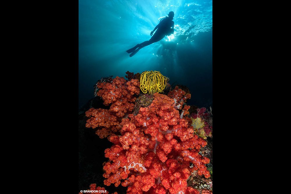 Above, clockwise from top left: A juvenile pinnate spadefish (Platax pinnatus) glides through colorful crinoids protruding from the reef. • This 3-inch-long male Nursalim flasher wrasse (Paracheilinus nursalim) is displaying for females as part of courtship behavior. • This dramatic split-level view shows the jungle-covered island above the waterline and colorful soft corals on the reef below. • Denise’s pygmy seahorse (Hippocampus denise) is less than 1 inch long and lives on gorgonian sea fans, on which it is often well camouflaged. All above photos BRANDON COLE