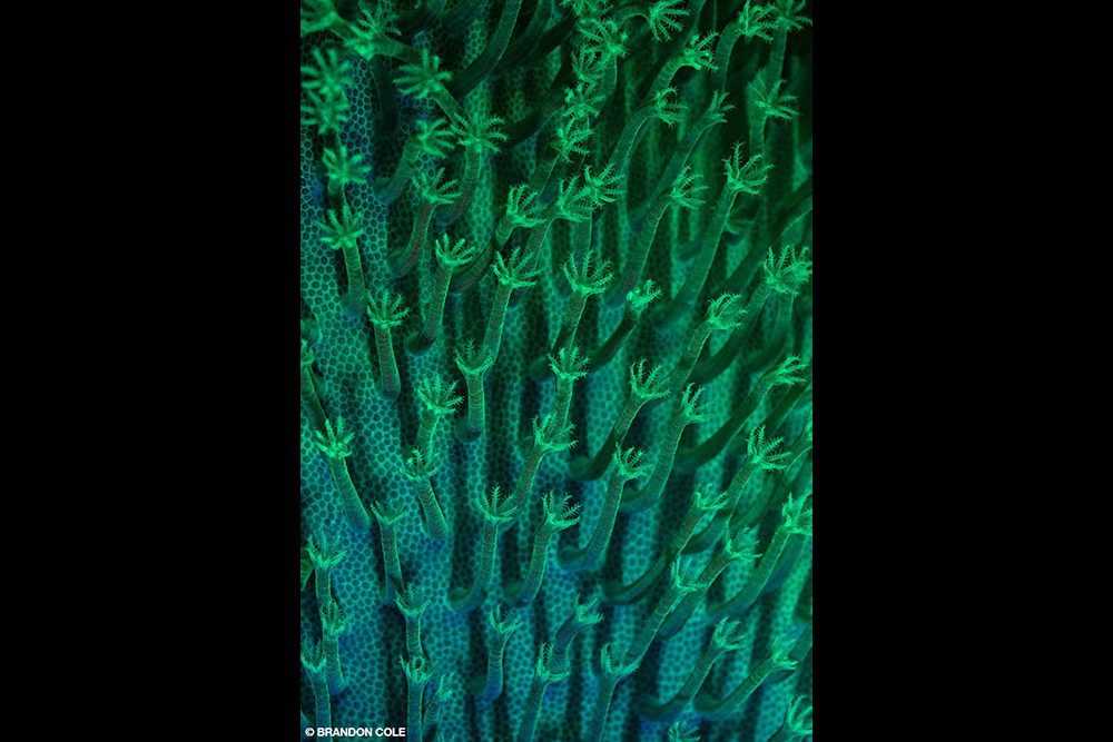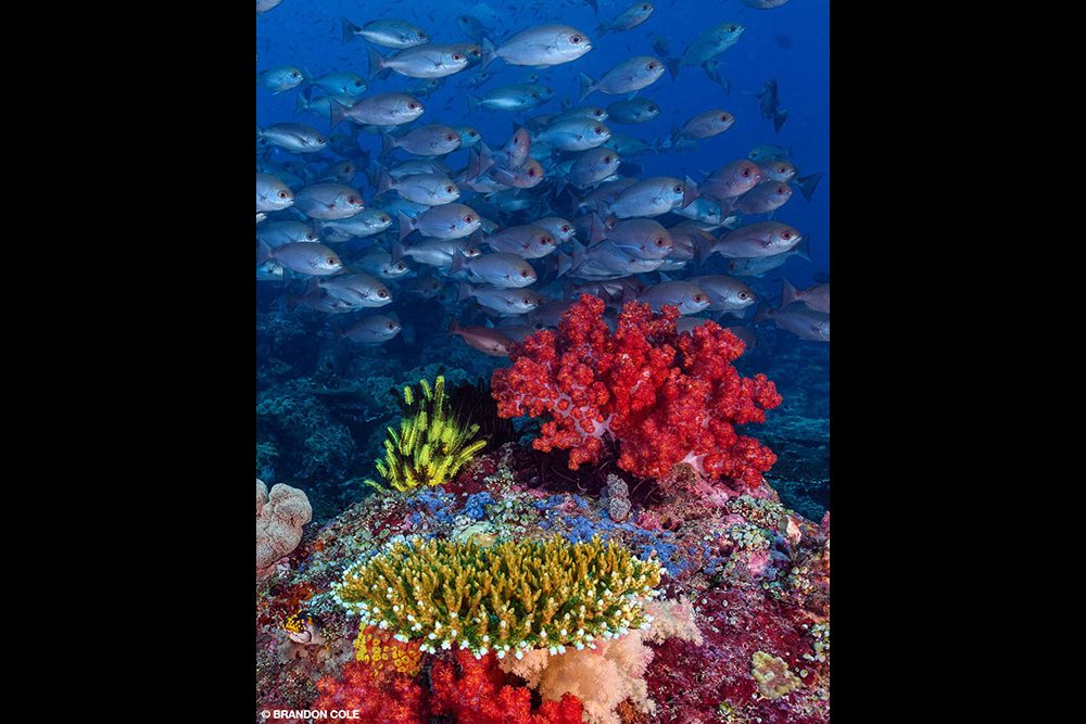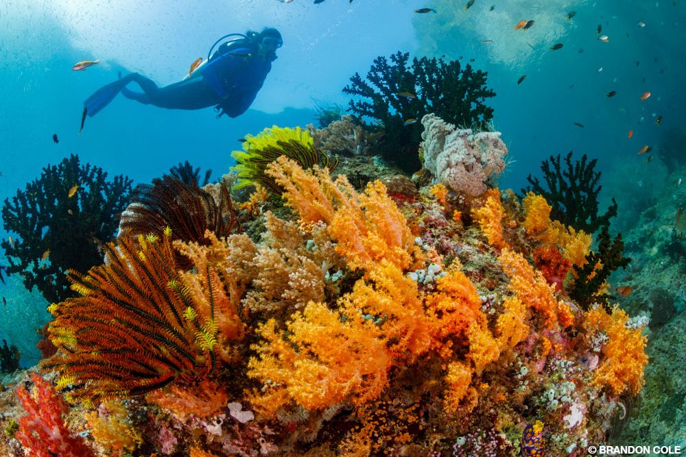 We launched into the current, twisted around to kick against it, and then looked up. Black coral bushes were everywhere, sprouting from the top of boulders and cascading down into gullies. Some tangles were frosty, crystalline white; others glowed gold or caramel. Yellow soft corals tipped raspberry red exploded from the reef like the finale at a fireworks show. There were lumps of orange cup corals, trees of green cup corals, and gloriously chromatic crinoids. The layers upon layers of contrasting texture and riotous color was a coral extravaganza indeed.