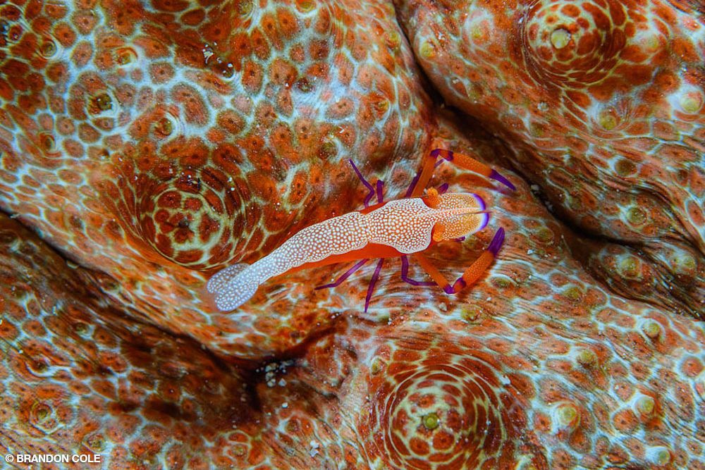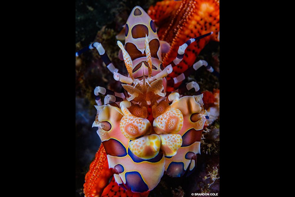 Froggies, nestled in a twisting, craggy, limestone-walled passage on the eastern flank of Iris Strait, had hazy 15-foot visibility but was home to a wealth of critters. Hovering just above the sloping bottom of fine, tan sediment, we carefully searched from 20 feet down to 60 feet and were generously rewarded with Tozeuma shrimp, crab-eyed gobies, upside-down jellyfish, and cryptic decorator crabs masquerading as sticks, tufts of algal scuzz, and moving rocks. If I had to choose a favorite from this dive, it would have to be the spiny tiger shrimp that’s smaller than a micro-SD memory card.