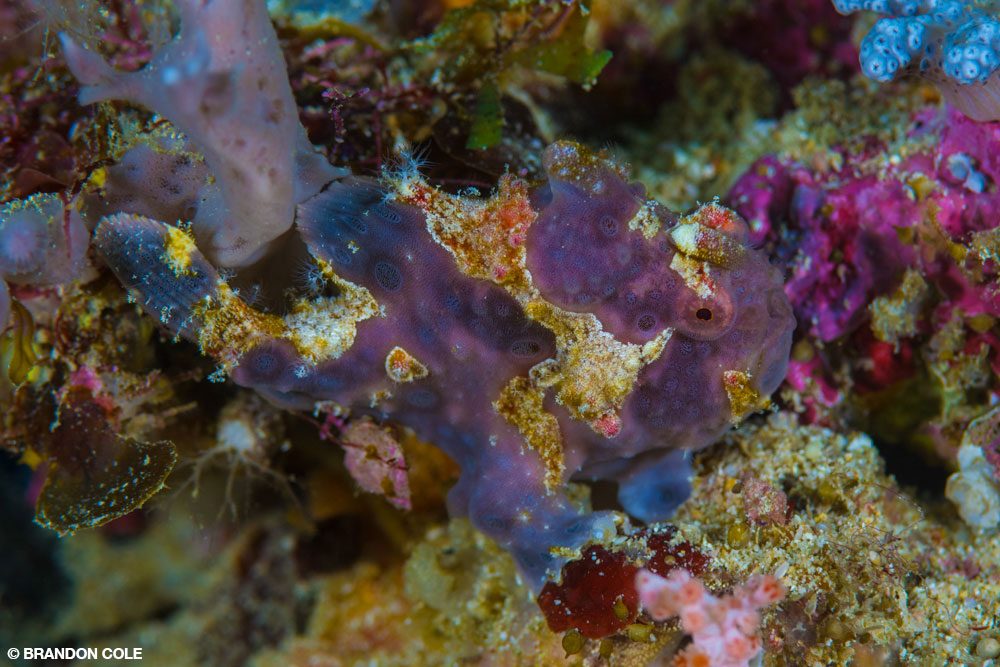 A return to Tangga afforded me time with creatures that went unphotographed when I was on the pygmy seahorse mission impossible, such as spindle cowries, schooling catfish, an urchin clingfish, and solar-powered nudis. Purple dottybacks, purple sea fans, and a purple frogfish flexing his fishing lure rounded out the hour.