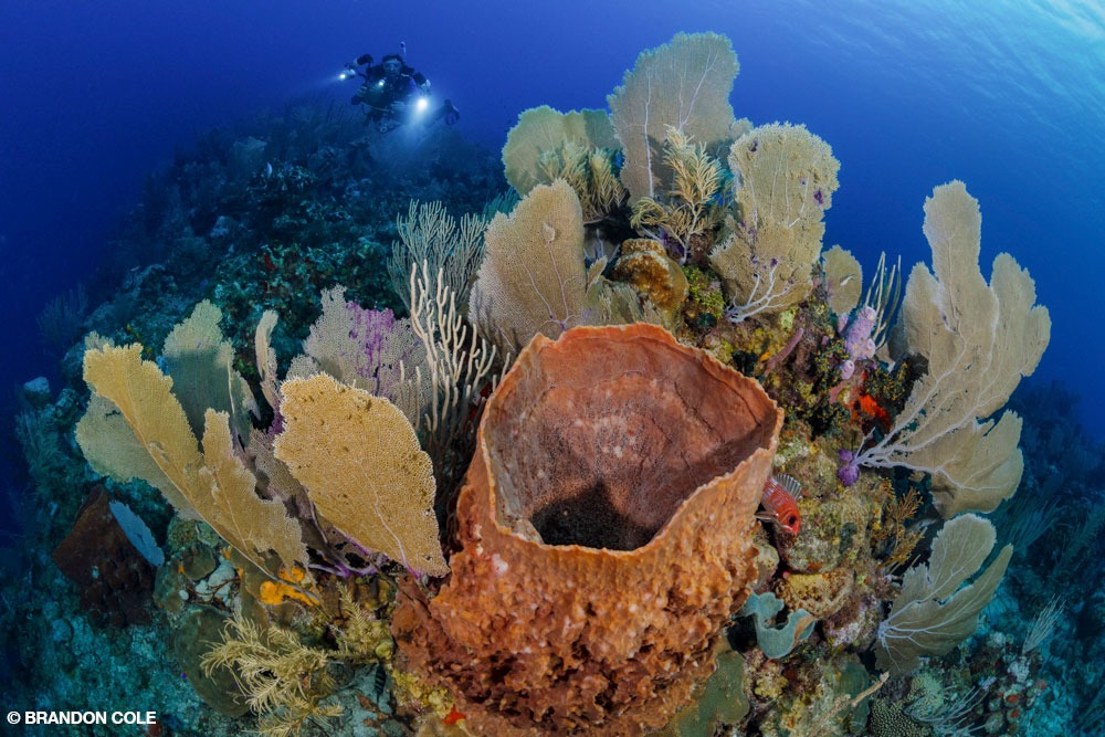 Valley of the Kings was a place name I did not know. It is due south of French Harbour, the starting (and ending) point for our weeklong cruise, and is another site with great three-dimensional reef structure. Here we found deepwater gorgonians and thickets of sea fans, giant barrel sponges, and orange, brown, and pink rope and tube sponges. Tucked into this invertebrate jungle were indigo hamlets, scrawled filefish, and stoplight parrotfish. Crevalle jacks patrolled off the wall, and clouds of sergeant majors hovered above the reef crest.