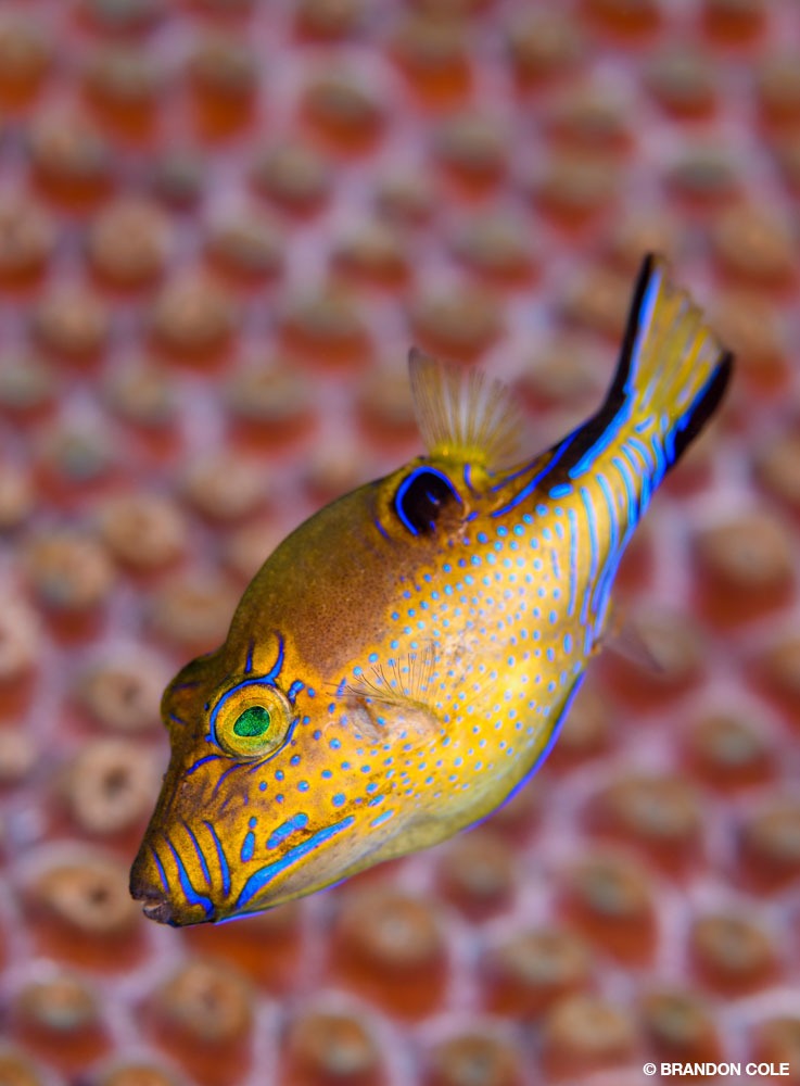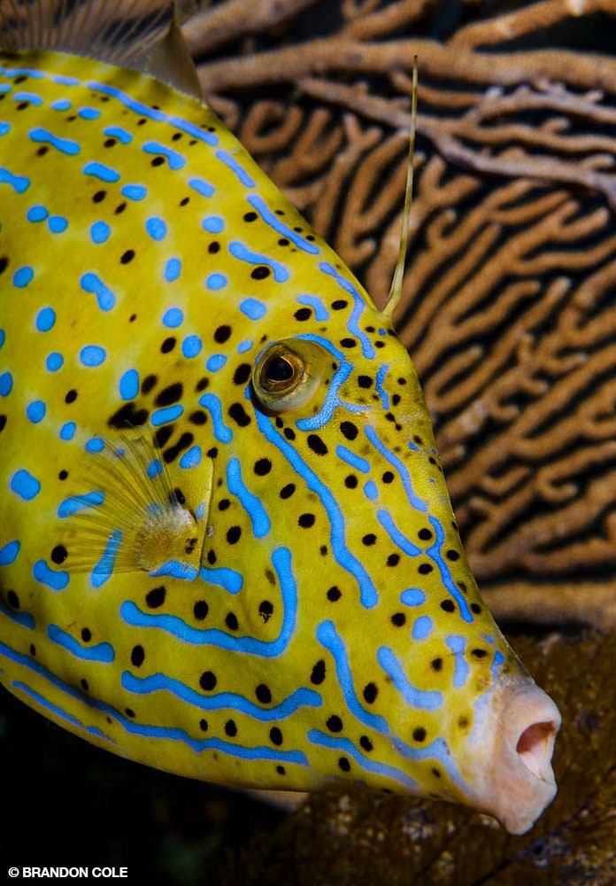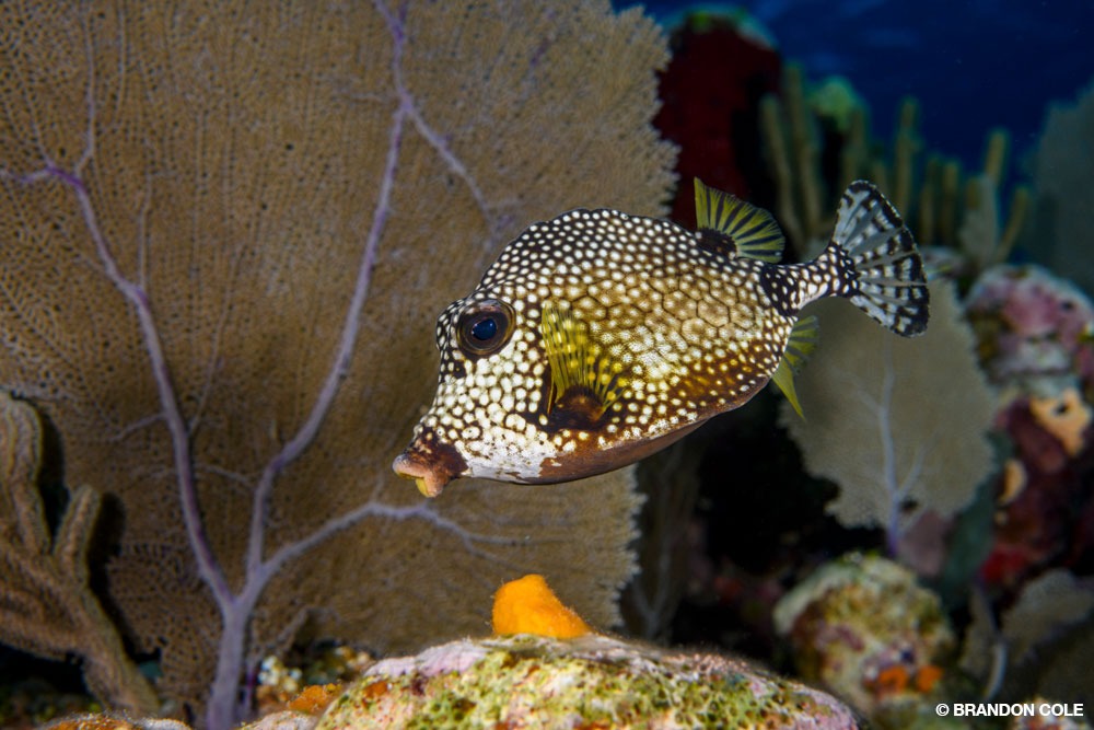 The dives gave us ample time along the sheer wall at 70 feet (21 m) to take pictures of a shy-at-first pink seahorse clinging with its prehensile tail to a pink sponge. Exquisitely colored purple and yellow royal grammas zipped around upside down in dark crevices on the site’s namesake spire 50 feet (15 m) down, and pouty-lipped smooth trunkfish puttered among the sea fans on the reef flat above in only 20 feet (6 m) of water.