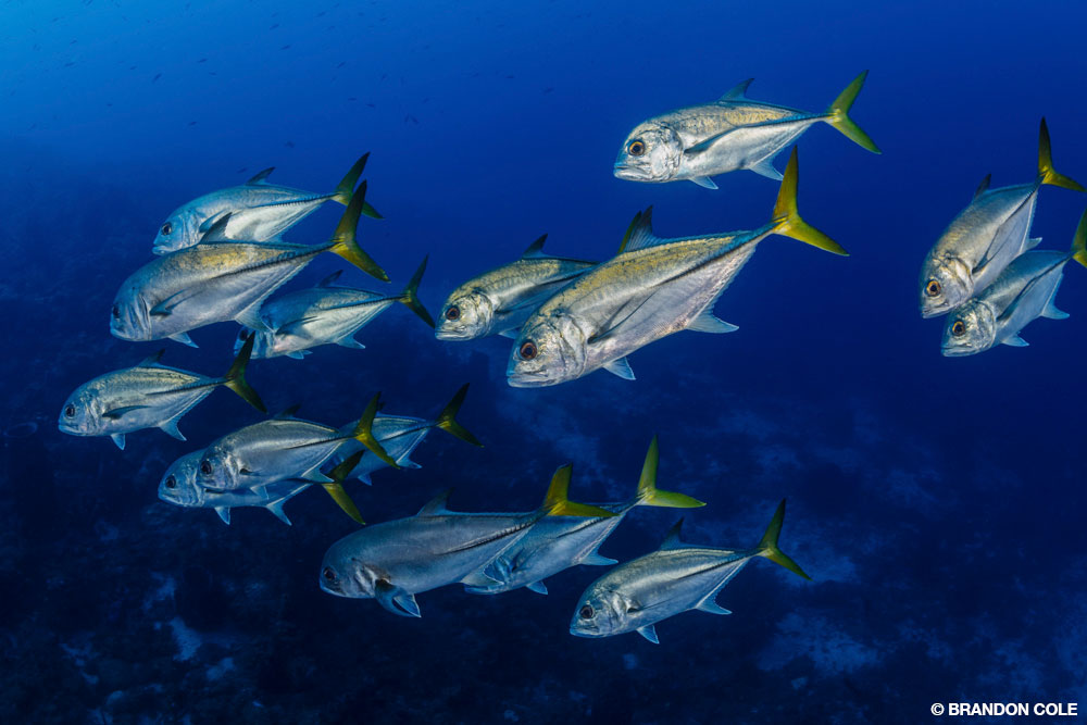 Our ship’s captain was leading the dive, and he signaled us to stop and wait at a point nicknamed Fish Market. Sure enough, a moment later a couple hundred horse-eye jacks streamed onto the scene at about 90 feet (27 m) deep, mirror-bright silversides flashing in the dark blue. The school broke into smaller groups that cycloned around us for a moment before speedily finning away, off to who knows where.
