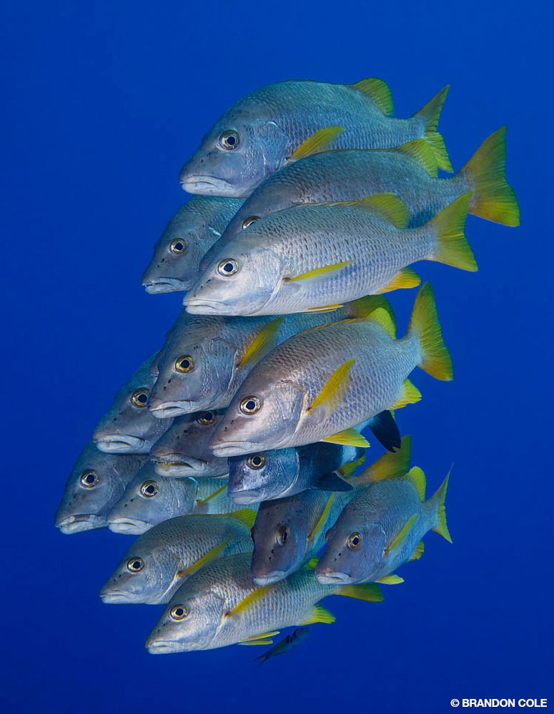 From the top of the reef at Mary’s at about 30 feet (9 m), we dropped over the edge, where visibility stretched to 60 feet (18 m), and a school of chubs arced through the blue. Below them a tight grouping of schoolmasters drew me downward. They obligingly maintained a close formation while I approached for a photo.