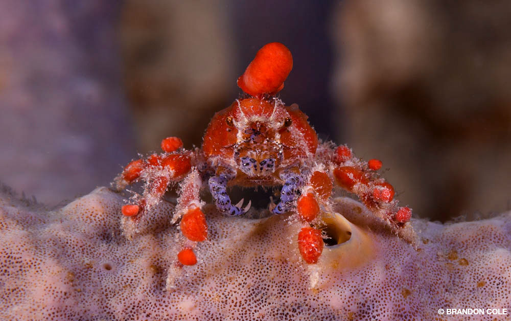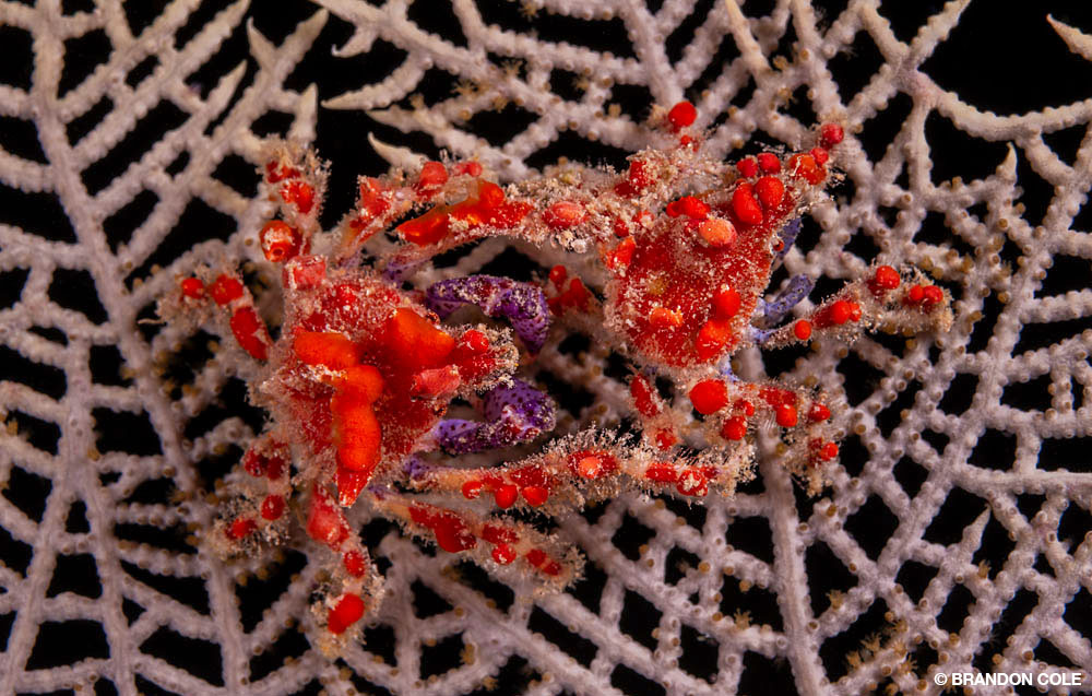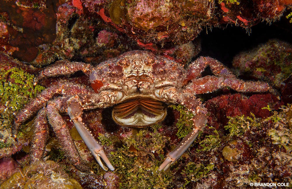 Flamingo tongue snails, cryptic teardrop crabs decked out in red sponge tufts, and a shapeshifting octopus on the prowl for crabs and shrimp were among the night dive highlights. Lobsters had also emerged from their shadowed daytime haunts to boldly march around under the cover of darkness.