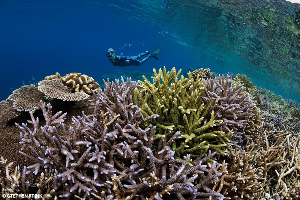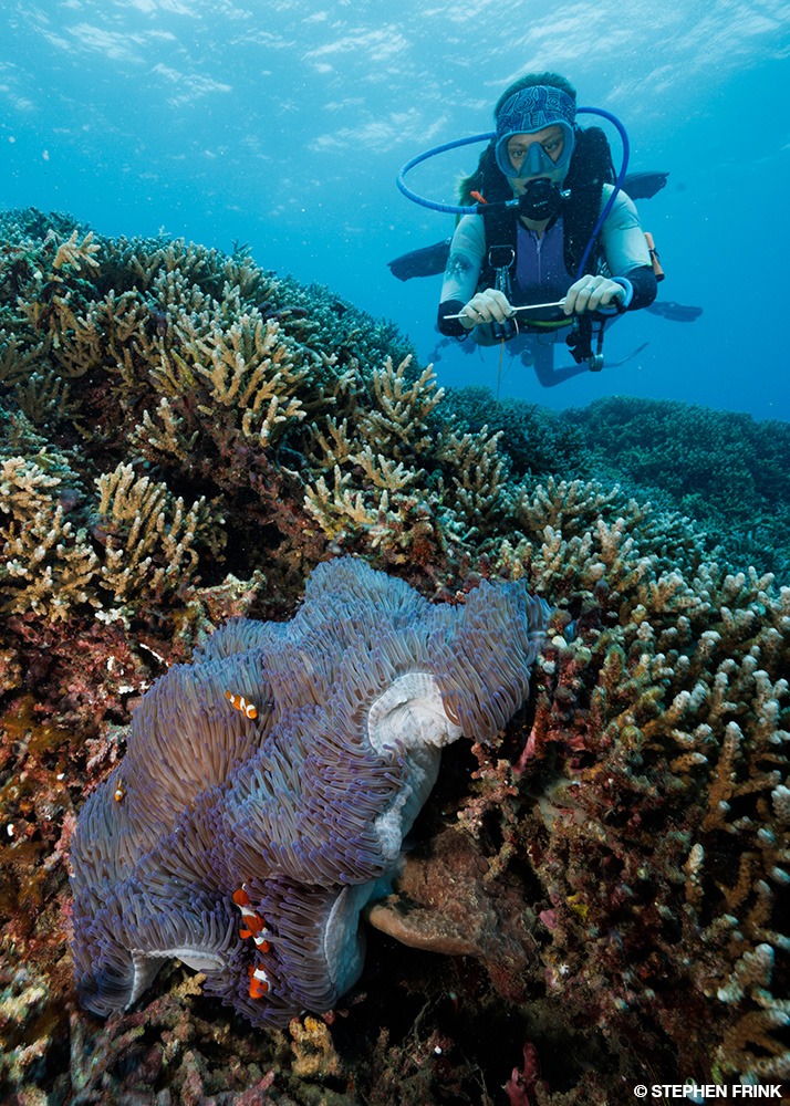 My first extraordinarily productive day came the next morning as we dived Kelapa Dua. This coral garden will go down in my memory card as one of the best of the best. It helped that it was a slick, calm day, so the water’s surface became a mirror reflecting the immense fields of staghorn corals just below the surface. One of the cruise directors agreed to dive with me that morning, swapping off duties as dive model, snorkel model, and behind-the-scenes photo documentarian.