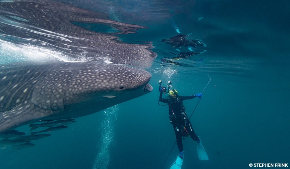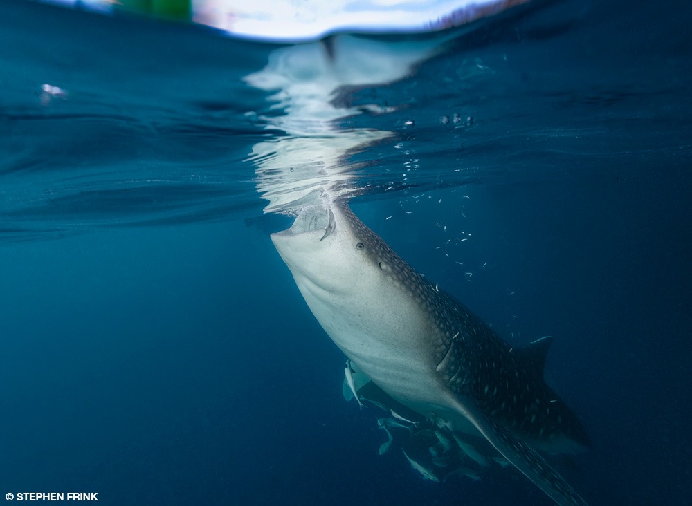 Our third morning offered the option of reef diving or interacting with whale sharks. We opted for the whale sharks, especially when the crew told us that we had a 95% probability of encountering them. There is a reason for the high percentage: A floating fishing platform with big nets strung beneath, called a bagan, has tiny bits of fish constantly floating in the water column below. These morsels are perfect for the filter-feeding whale sharks, so a chain of commerce evolved. The bagan attracts the whale sharks, the whale sharks attract the divers, and everyone gets paid a little something — everyone except for the tiny fish that get caught in the nets each night, but that would happen with or without the divers.