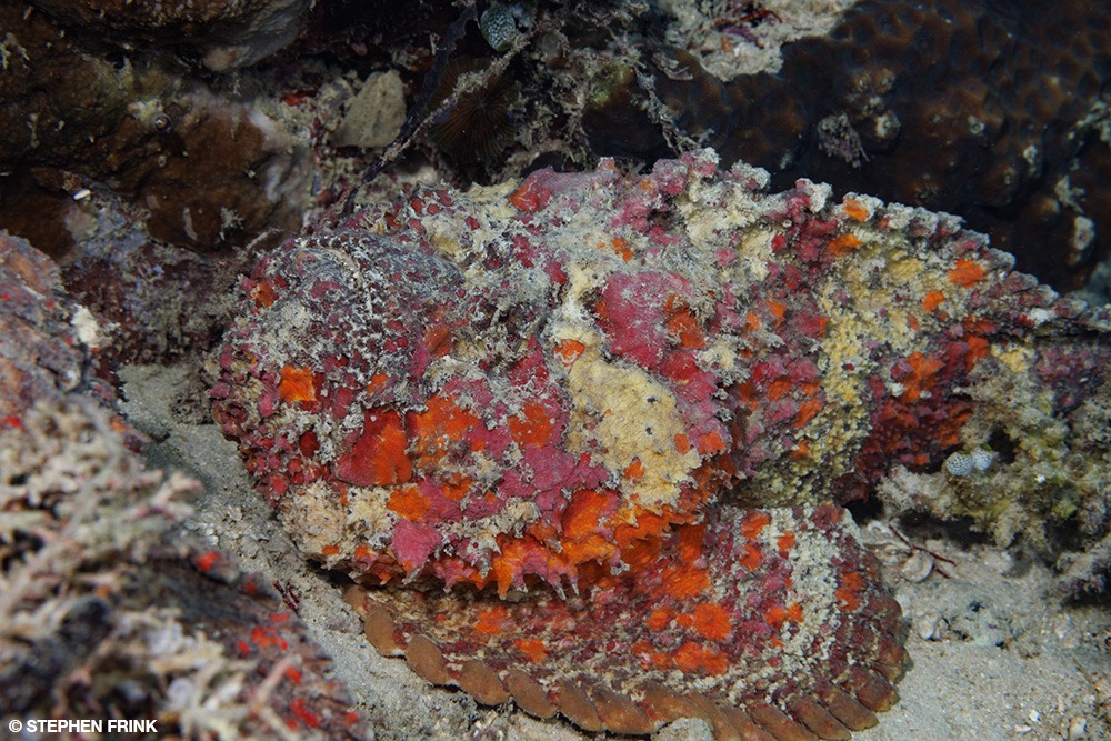 Despite the availability for divers, we were alone in the water at Darma Point, surrounded by dozens of cornetfish, batfish at cleaning stations, dwarf cuttlefish, twinspot lionfish, and even a bamboo shark, which I regrettably did not see. I found a pair of stonefish snuggled up to one another on the seafloor, and their proximity allowed me to get both of them in the same frame with my 100mm macro lens.