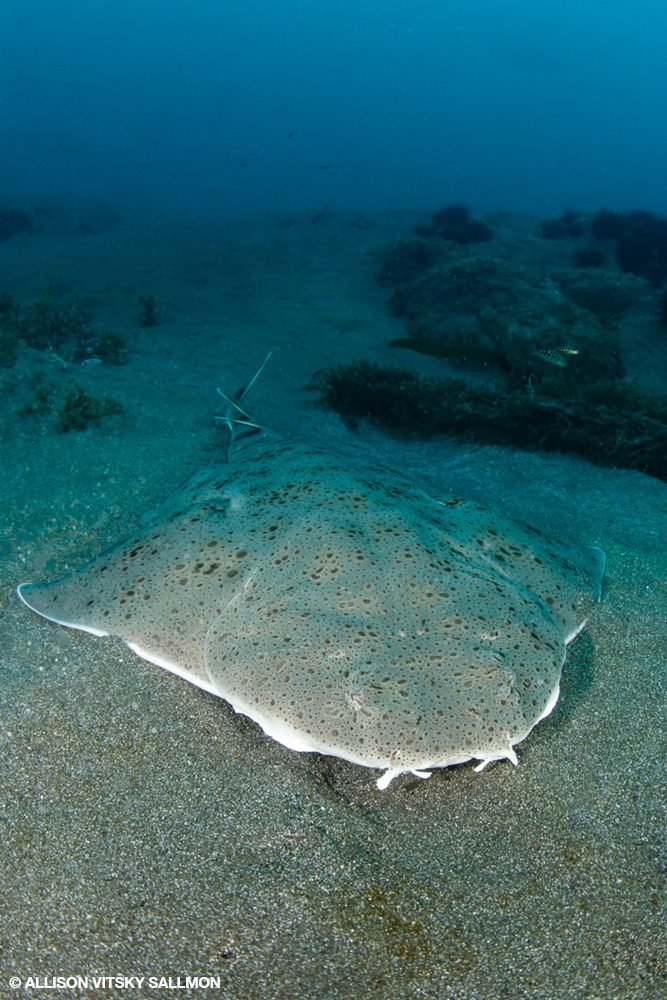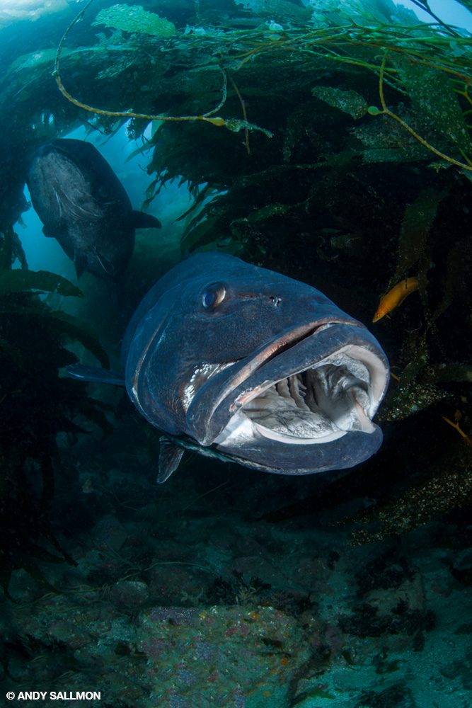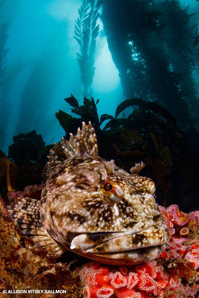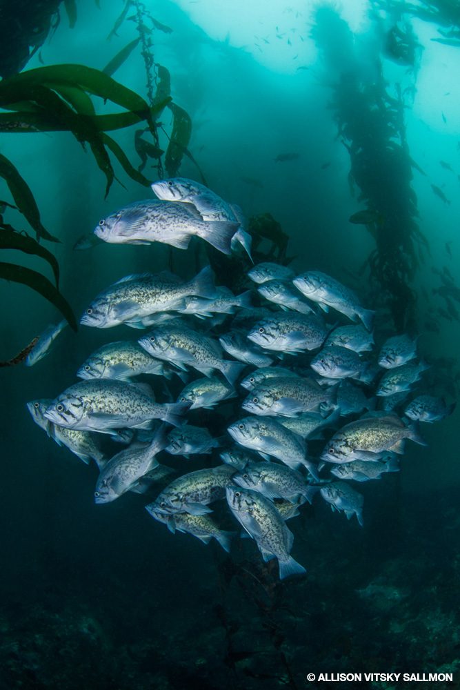 On our last day, we head to Anacapa (a cluster of three islands, numerous surface-piercing pinnacles, and adjacent Arch Rock, a natural bridge commonly used to showcase the overall gorgeousness of the Channel Islands) to dive Aquarium, a huge site with a thriving kelp forest. The visibility today is spectacular, and after a fleeting encounter with some yellowtail during our descent, we’re greeted by several giant black sea bass. An angelshark lurks in wait for prey on the sandy bottom; he’s badly disguised, if you ask me, but I’ll take it since that just makes him easier to photograph.