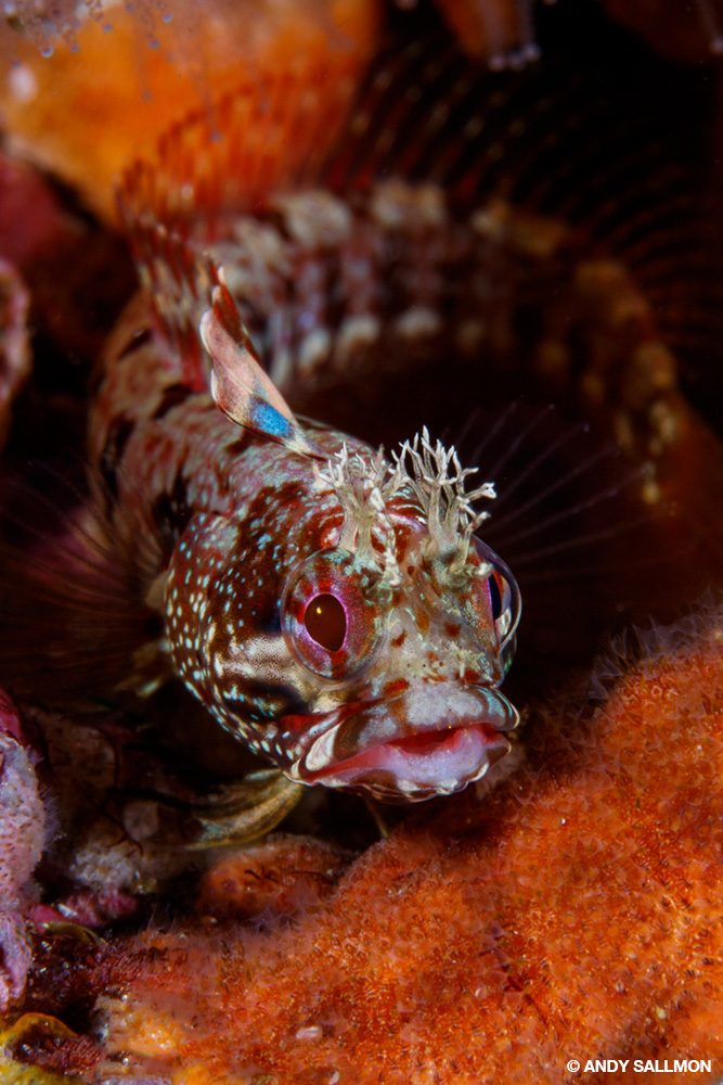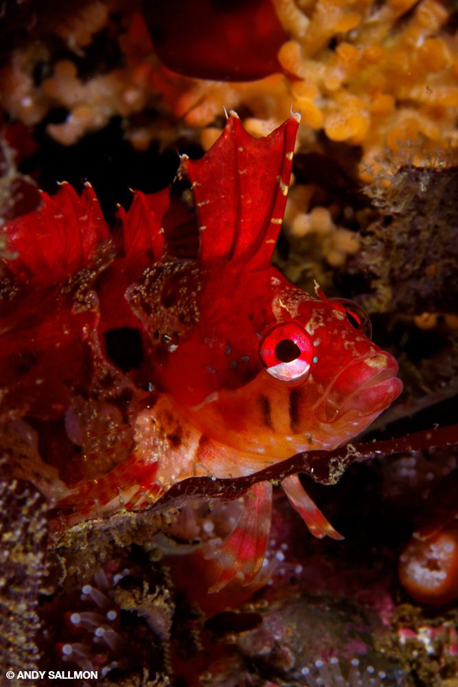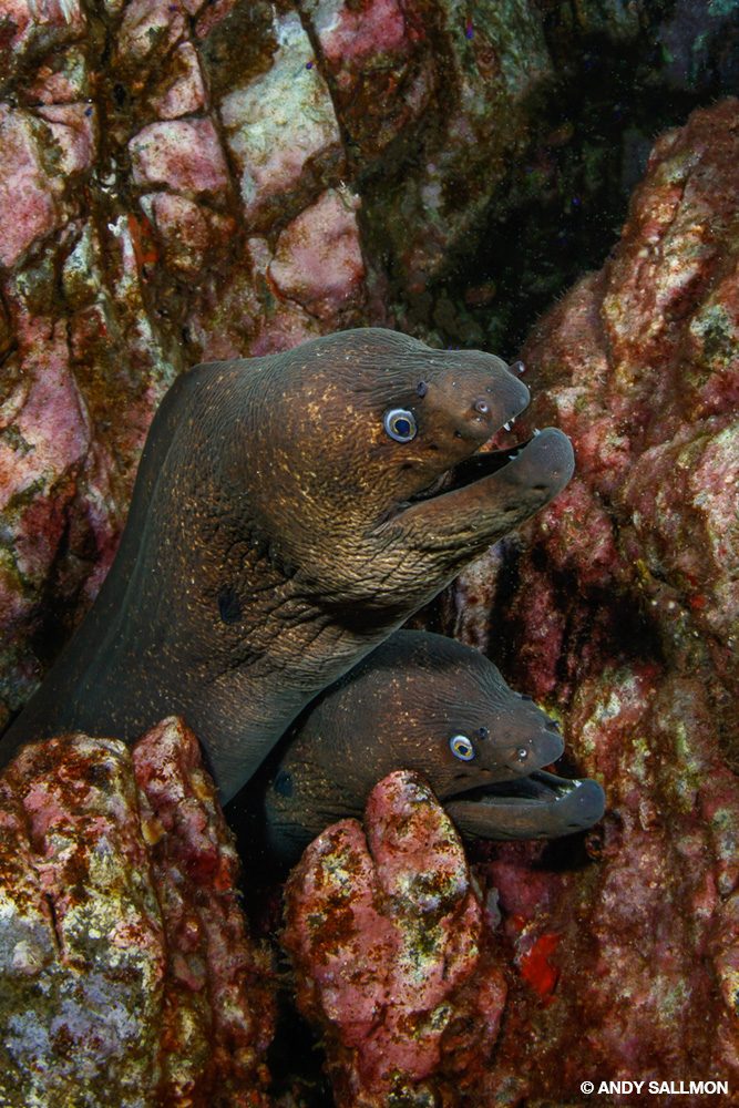 We spend our second day diving Santa Cruz Island, a behemoth that measures 96 square miles (248 square kilometers) and contains two mountain ranges as well as one of the world’s longest sea caves. The island’s size and height and its abundant coves mean there is almost always an accessible, calm place to dive, and even the most protected sites are full of fantastic subjects. It’s calm enough to start our day on the backside, first at Gull Island, a small islet adjacent to Santa Cruz that offers hydrocoral-studded rocky reefs set in a thick kelp forest, followed by Flame Reef, named for its multitude of fiery red gorgonians.