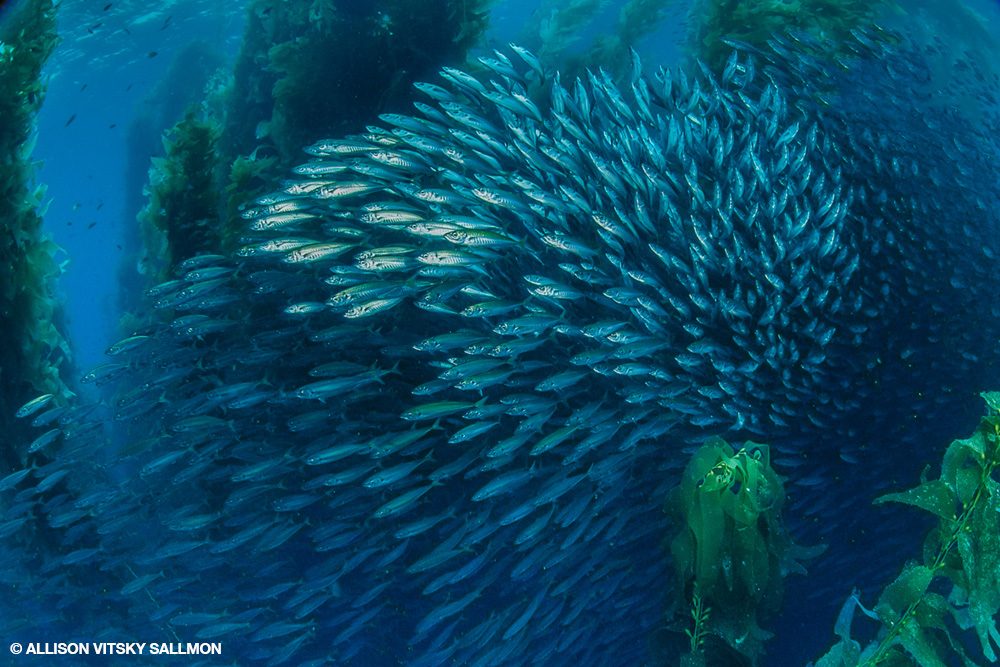 San Clemente welcomes us with one of the smoothest crossings to the islands we’ve experienced. You would think the anchor dropping before 6 a.m. would make people grumpy, but our group is well-rested and ready to go — almost everyone is on deck enjoying coffee and a glorious sunrise not long after we’re awakened. Since everyone’s already on deck, the crew provides an early dive briefing, and everyone begins to gear up. We’re delighted to recognize that we’re anchored in the Pyramid area, which contains some of the most stunning dive sites San Clemente has to offer, including the Underwater Arch, The Boilers, and China Point. These vistas feature lush kelp and an array of most-wanted marine creatures, such as harbor seals, soupfin sharks, and bat rays. The water is exceptionally clear and blue today, and descending into the towering kelp forest behind the boat is like swimming directly into the archetypical Southern California dive site. During one of our surface intervals, we notice a flash of silver at the edge of a nearby kelp bed, followed by streams of jumping fish. We hurriedly get geared up and jump back in to discover a huge school of baitfish herded by the most delighted (and chunky) sea lion on the planet.