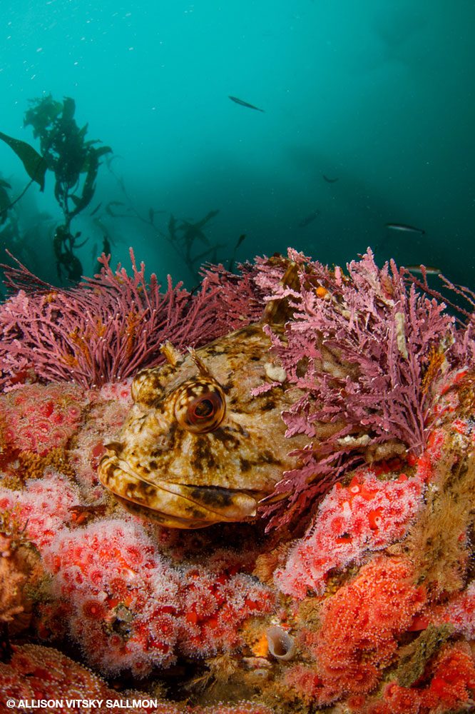 We spend our final day at Catalina Island, the most easily accessible of the Channel Islands and the only one inhabited by full-time residents. Before the wind becomes prohibitive, we get in a dive at Farnsworth Banks, a series of hydrocoral-encrusted pinnacles on the backside of the island that is indisputably one of the best dives in Southern California. This site is a darling of underwater photographers since there is a high probability of success at finding fantastic subjects nestled against spectacular violet-hued hydrocoral backgrounds. We’re especially fortunate today, as marine life is plentiful, and a large school of mackerel is circling in the water column. We’d beg to stay put, but the ocean is beginning to deteriorate; the captain announces that he’s planning to take us to some of the sites at the more protected, inner west end of the island before we head home, and it’s tough to be too disappointed at the prospect of searching for pinnipeds at the rich kelp sites such as Eagles Nest and Johnson’s Rock. As we round the edge of Catalina, we gaze back at Santa Barbara, bidding the southern islands a fond, but fortunately temporary, farewell.