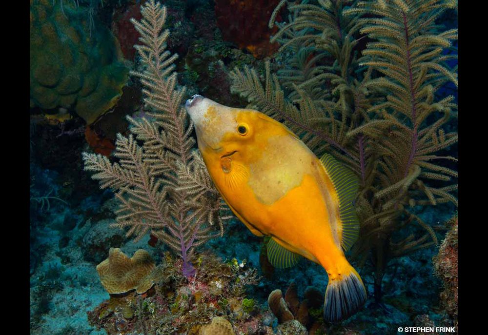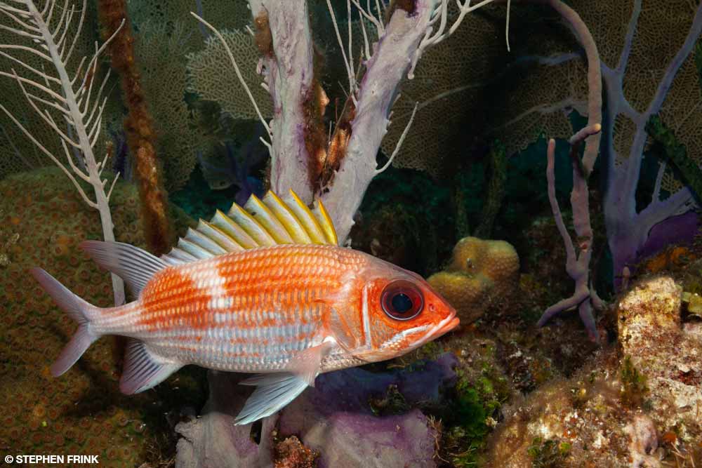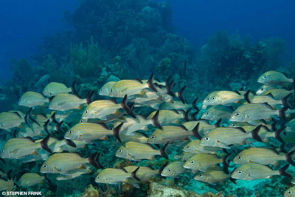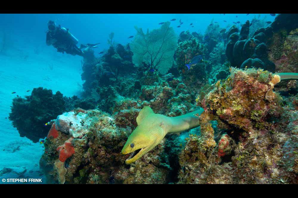My most recent trip began with a dive at Grunt Valley to fulfill my desire to shoot some schooling fish. Schools of Bermuda chub mingled with various grunt species and schoolmaster snapper along the high-profile coral heads at 25 to 35 feet. There was a curiously high density of lobster this time, and while the reef looked much the same as when I last dived here in 2012, the snapper and grunts were noticeably more skittish. Two years with fewer divers may have had an effect, but no doubt they will soon reacclimate to the presence of divers and go about their business in the same unperturbed manner I remember. This site is great for a warm-up dive.