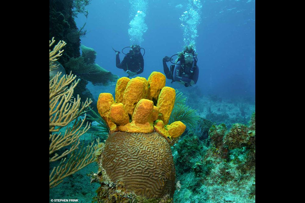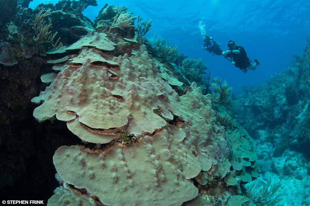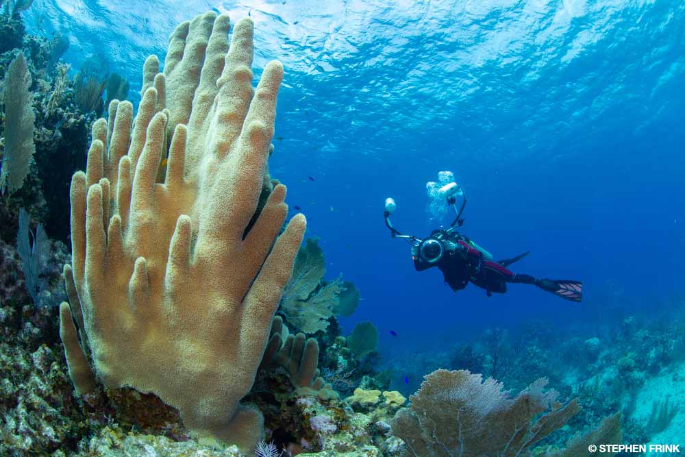 In keeping with the retro theme of the week, our last dive was to Angel Reef. This time my dive buddy was Jason Belport, who had started his long and distinguished career in dive operations as a divemaster on Cayman Brac and retained an intimate familiarity with these reefs. When I told him I was still on the hunt for pillar coral, he unerringly directed me to an especially impressive specimen. Once I knocked out that photo op, we embarked on a swim around the corals in the 40- to 50-foot range. I was delighted to see a Nassau grouper swim a beeline toward me, slam on the brakes, and expectantly stare at me.