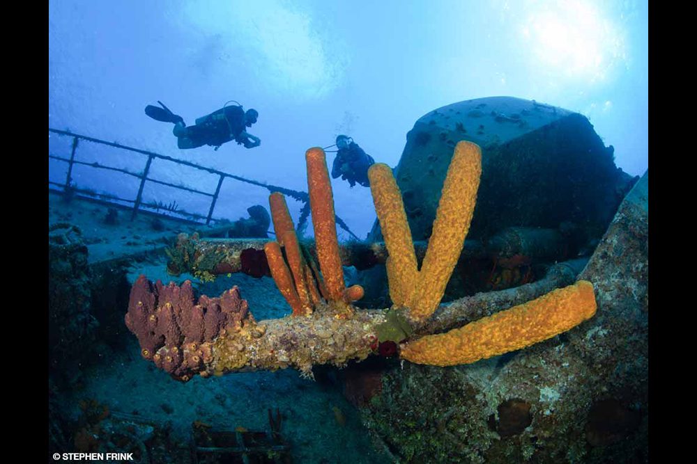 A quarter-century on the bottom has taken a toll on the Tibbets. It is no longer upright and now rests on its port side along the sand slope. Much of its superstructure has collapsed. I descended to about 85 feet to begin the dive by photographing a large cluster of tube sponges on the bow railings. Most divers probably swim to the bow and gradually work their way up the decks past colorfully decorated railings, pause at the forward gun emplacement, swim past the debris field that is now amidships, and finish the dive at the shallower stern guns and deck.
