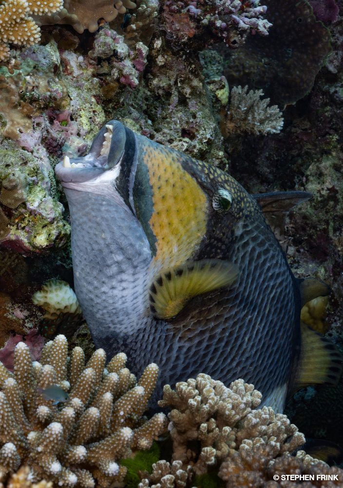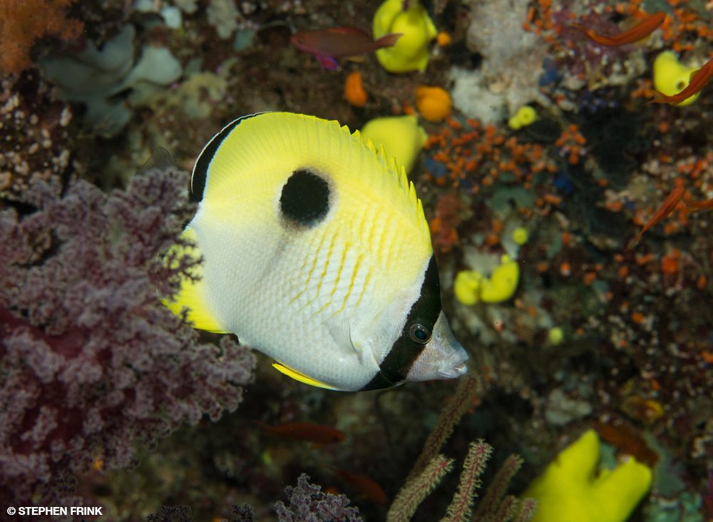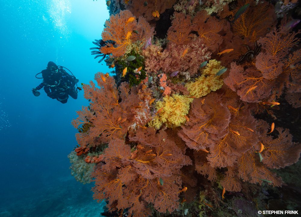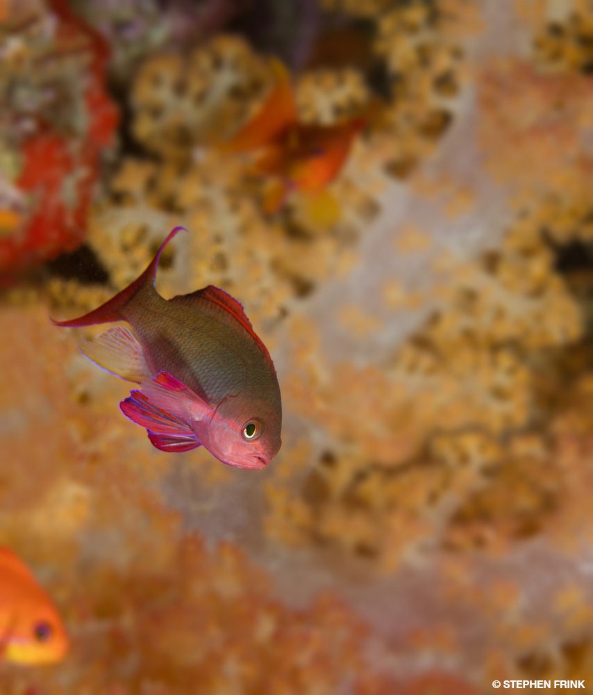 We next headed to Mellow Yellow, named for the concentration of yellow soft corals growing on the current side of the reef pinnacle. The top of the pinnacle was my favorite. We barely dipped below 40 feet (12 meters) as there was so much action in the shallows. Pink and purple anthias clouded the top reef and squeezed into every gap. There was every kind of coral: leather corals, hard and soft corals, and even large purple anemones hosting orangefin anemonefish. The level of reef biodiversity was unbelievable.