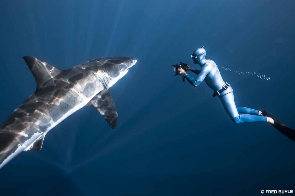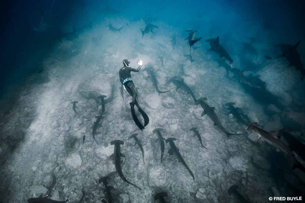 A lot of my other work in conservation circles happened because freedivers can do things that are impossible on scuba or rebreathers because they are too cumbersome and intimidating to the animals. We attached acoustic tags for tracking migration to scalloped hammerhead sharks in Rangiroa, Tahiti, along the Eastern Pacific Corridor (the Galápagos, Cocos, and Malpelo), and to great whites off Guadalupe Island in Mexico. Our unobtrusive presence made us valuable underwater assistants to the shark researchers.
