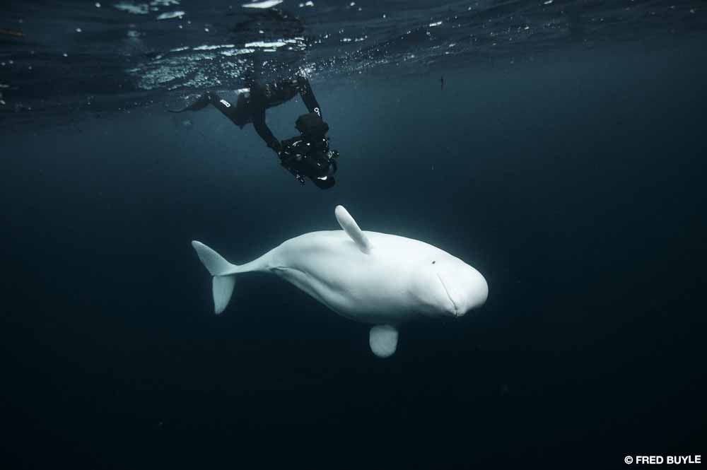 The diversity of your subject matter — great whites, tiger sharks, mantas, whale sharks, sperm whales, and even belugas — gives a sense of how geographically committed you are. Since you can travel lightly without strobes and scuba gear, do you feel that contributes to a minimalistic approach?
