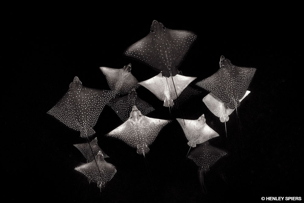 Born during the great mobula aggregations of spring, juvenile Munk’s devil rays remain in the Sea of Cortez long after their parents have left, using the shallow bays of Espiritu Santo Island as a nursery. By autumn the water is clear, which is a bonus for underwater photography, but it also signifies less food for the filter-feeding rays. Plankton gathered around the green light hanging from the back of our boat, and the rays gratefully swooped in for a microscopic buffet. Their grace entranced me as they flew through the water after their prey. I used a two-second exposure to capture the aquatic ballet.