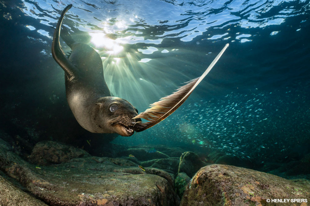 Young sea lions use play to learn the skills they will need as adults. This joyful education relies on manipulating and chasing various objects, and sea stars are a particular favorite. The young sea lions pick up a sea star from the seabed, swim to the surface, and then drop it before they give chase. I shot this picture of the underwater game of fetch just as the pup came back down to seize the falling sea star.