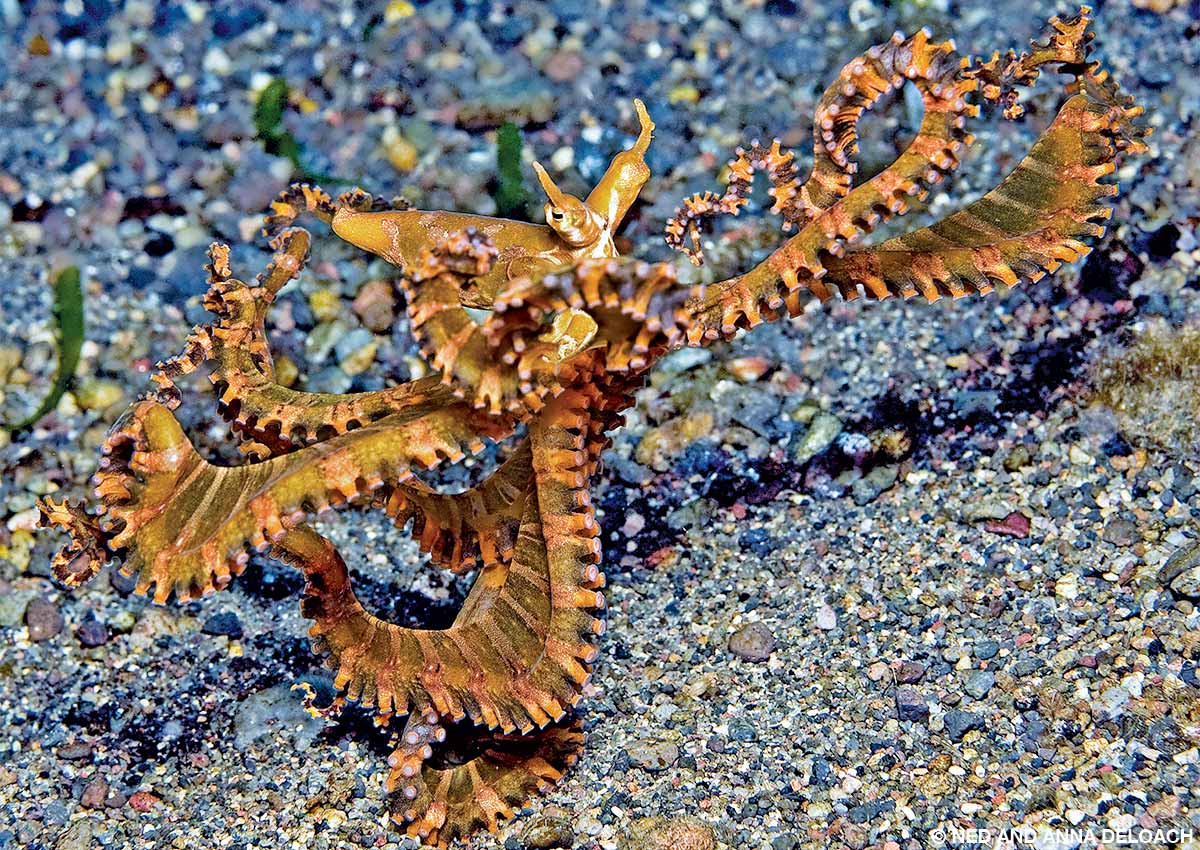 After long, motionless minutes, the octopus began undulating its arms as if conjuring a spell before collapsing to the bottom and casually gliding away in a more typical octopus fashion across the flat, algae-tufted terrain of Lembeh Strait. As it passed a patch of sand, a 3-inch (8-centimeter) shrimpgoby flew off the bottom as if shot from a sling and smashed into the octopus’ mantle. Unfazed by repeated attacks, the octopus continued until it arrived at the quarter-sized entrance to the goby’s burrow, which was kept in repair by its symbiotic partner, a subterranean snapping shrimp.