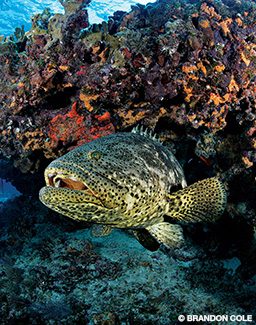 An Atlantic goliath grouper swims alongside a colorful coral reef in the Florida Keys National Marine Sanctuary.