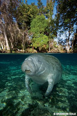 Calm water and a large dome port helped the photographer create this over-under portrait of a Florida manatee surfacing to breathe.