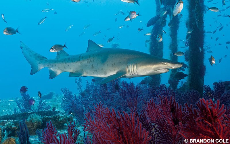 The sand tiger is one of my favorite homegrown charismatic megafauna species. What’s not to like about a sinister-looking shark sporting diabolical dentition that also happens to be easily approached and safely admired? No chum is needed to draw in Carcharias taurus. The complex structure provided by wrecks undoubtedly is partly responsible for their presence, but the sharks aren’t saying why else they favor the Graveyard of the Atlantic.