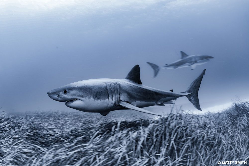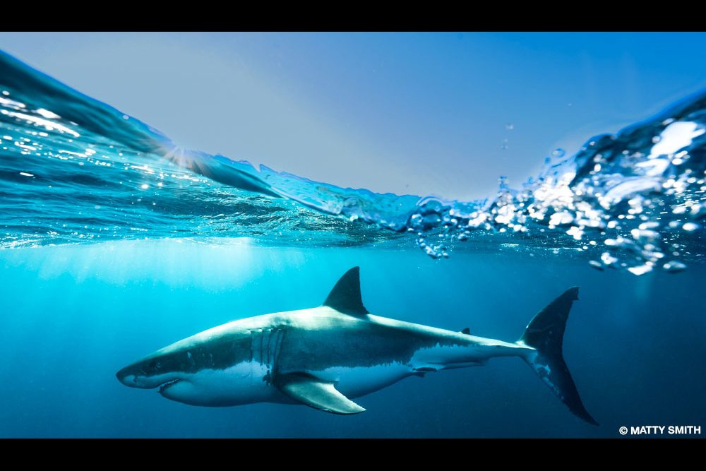 I wanted to shoot a split waterline image of a great white shark, and on this day at the Neptune Islands in South Australia, I got my chance. The wind had dropped off, and in the evening the ocean was glass. I needed a calm shark to avoid risk to myself or the animal while pulling off this image. This shark circled near the boat’s stern for half an hour. It displayed relaxed body language, so I attempted the shot. Shortly after placing my pole-mounted camera in the water, the shark showed some interest and cautiously approached. I quickly fired a sequence of frames before safely pulling the camera out of the shark’s way.