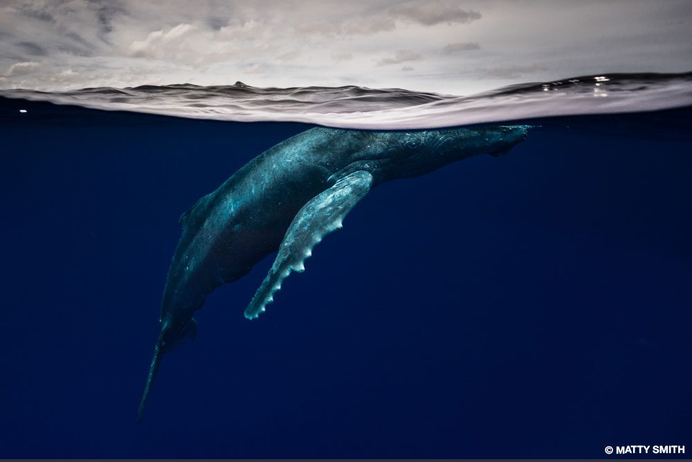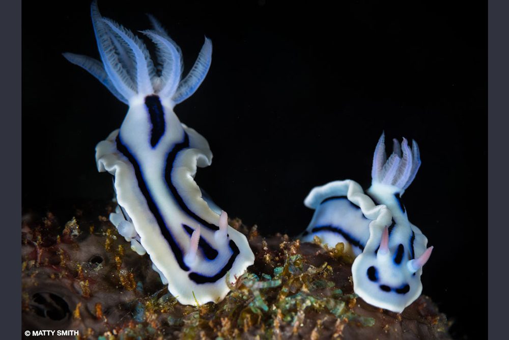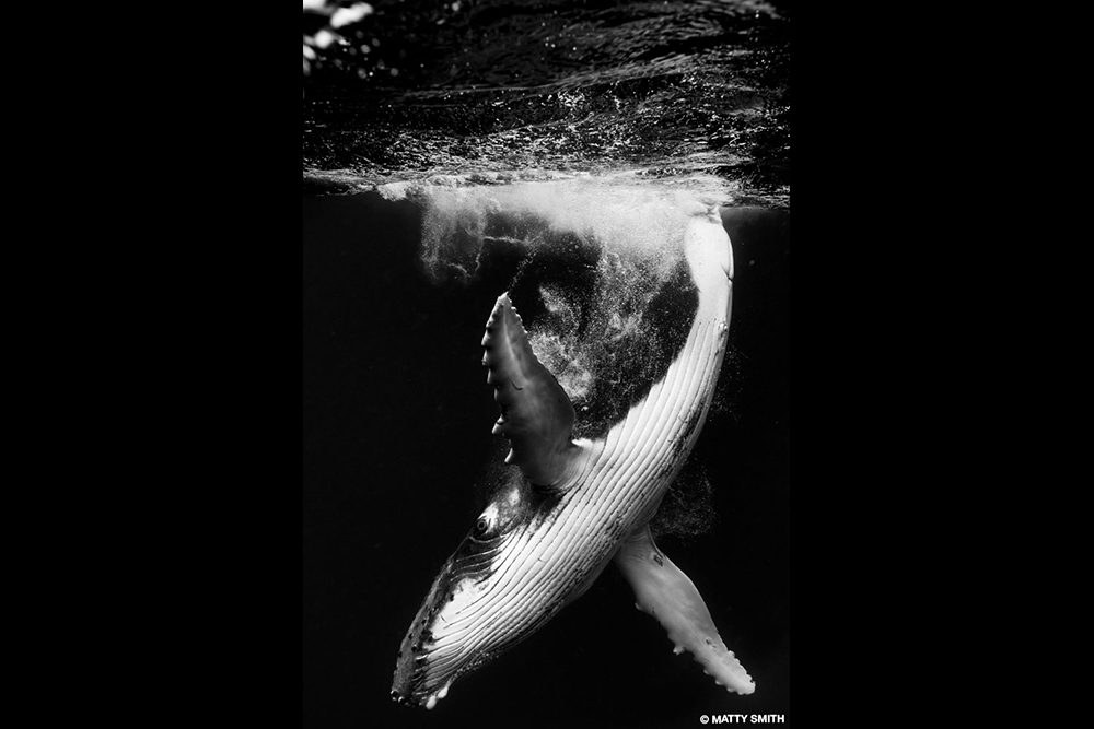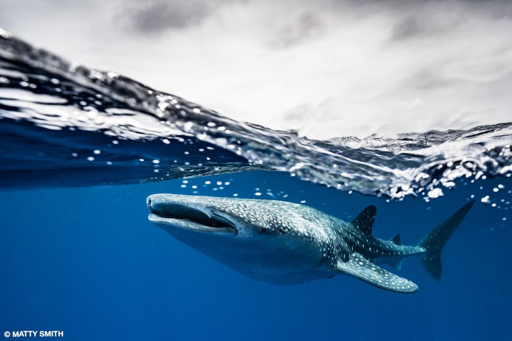 SOMETIMES A SINGLE CLICK OF THE SHUTTER release can change a career trajectory. That’s what happened in 2014 after Matthew “Matty” Smith won a category in the London Natural History Museum’s prestigious Wildlife Photographer of the Year Award. He was aware of the stinging cnidarians known as bluebottles (Physalia utriculus)from a lifetime of surfing. Colonies of them sweep along Sydney, Australia’s beaches in summer. Matty had the idea of photographing them using a close-focus, wide-angle technique. They aren’t very large — the floats rarely get larger than 6 inches (15 centimeters) — so to make it appear impressive in the photo, he had to work very close and use perspective distortion to his advantage. Because the long tentacles dangling underwater are critical to the illustration, his idea was to shoot an over/under using a dome port on a camera housing to capture the above and below in a single frame.
