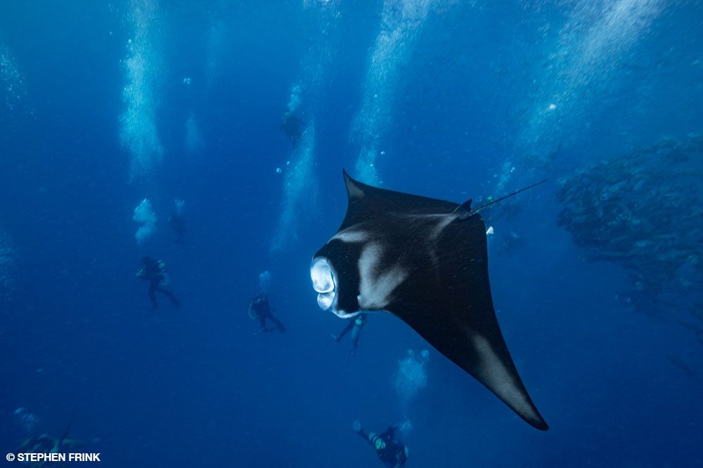 Underwater, the channel has become a manta mecca due to several cleaning stations at just 45 feet. The dive guides know where to position divers, and it typically doesn’t take long before mantas will queue up for their daily dose of hygiene. They are indifferent to the presence of divers, and proximity is probable for anyone patient enough to kneel in the sand and wait.