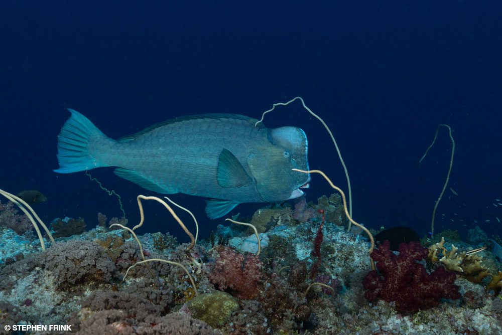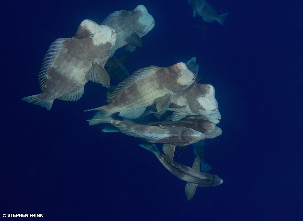 This spawning event at Grassland might have been a secret at one time, but seeing 11 boats converge here so early in the morning suggests the word is out. The largest known spawning aggregation of bumphead parrotfish (Bolbometopon muricatum) happens with a monthly lunar phase if the tide and temperature are right.