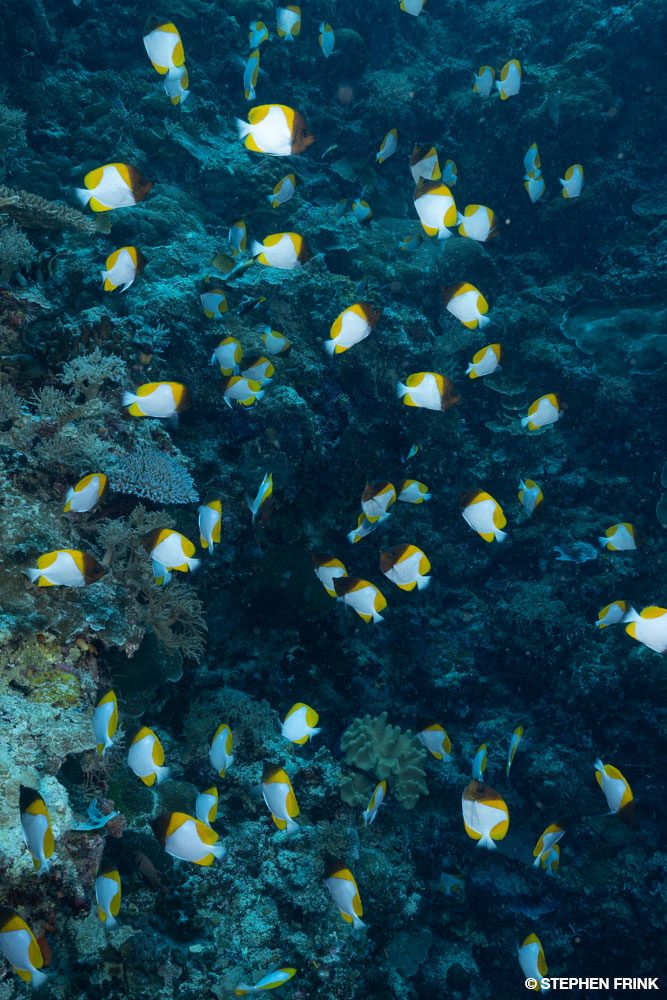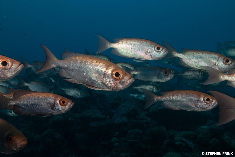 We dived German Channel several times, so the novelty of getting close to a manta faded over the week. But late one afternoon we were treated to a remarkable frenzy of bohar snappers, rainbow runners, and manta rays as they converged to feed on a plankton-enriched current flowing through the channel. All the action happened in the top 20 feet of water, with the mantas making loops with their mouths agape and the massive schools of snappers greedily chomping away. We hoped for a repeat but never again had that synergy of conditions during our time on location.