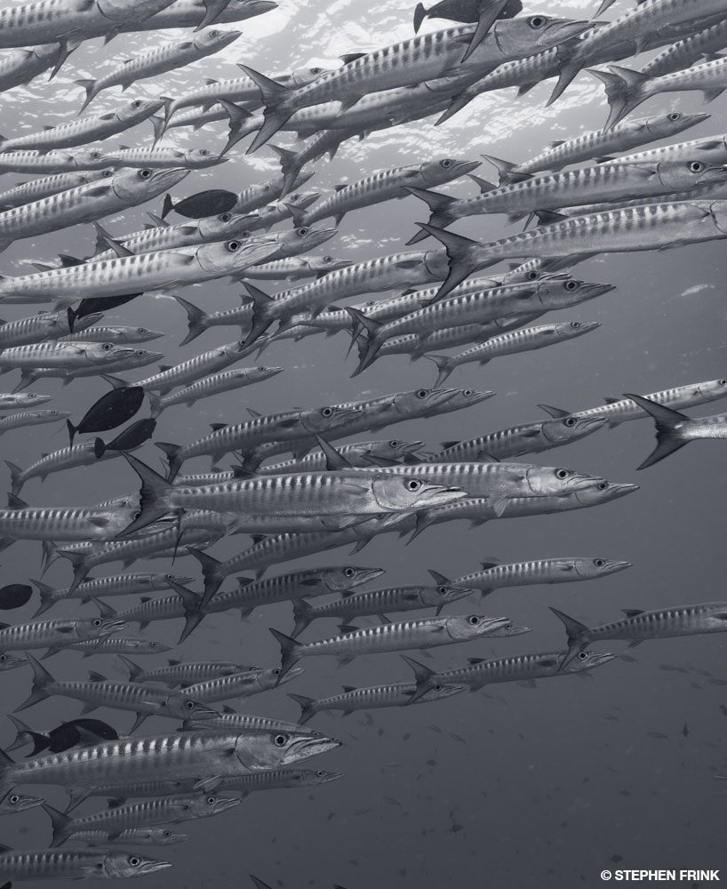 The wall is nicely decorated with large, colorful sea fans and clusters of pyramid butterflyfish that exasperate me, because I can never get near enough for the close-focus, wide-angle shots I envision. The schools of snappers and barracudas are far more tolerant of my approach.
