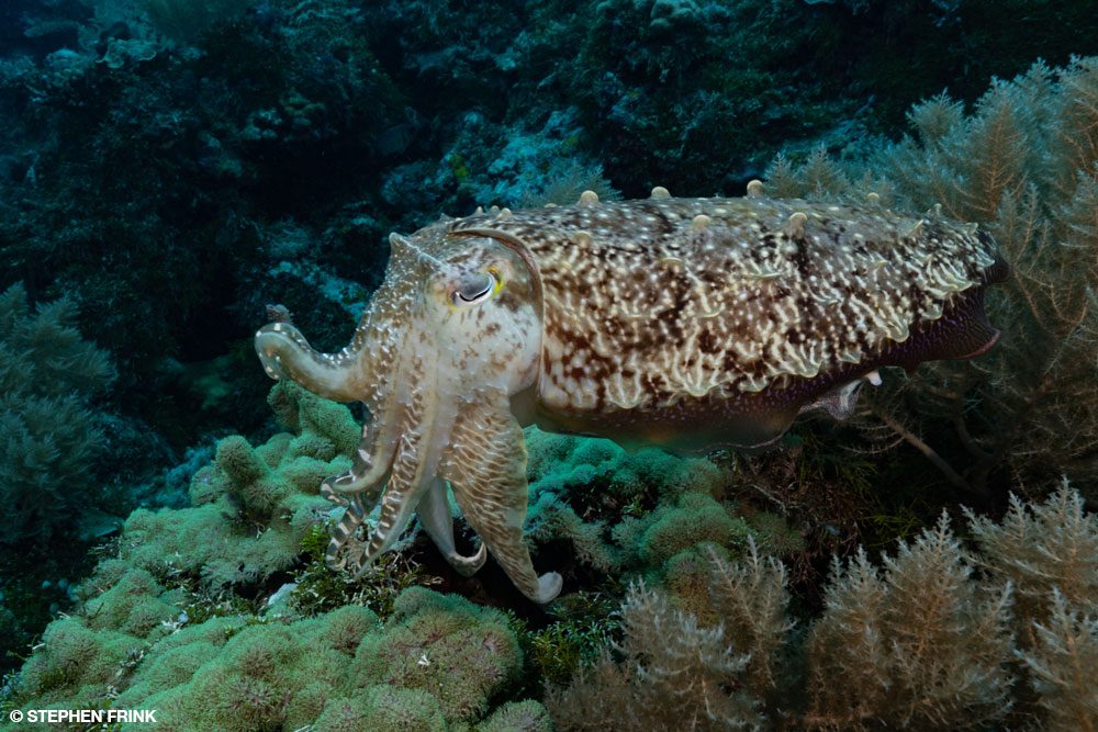 We went to nearby Dexter’s Wall for our next dive, where we found an exceedingly calm cuttlefish impervious to our proximity. The bottom features are similar at many of the wall sites here, including the famous Blue Corner, which is only a few hundred meters away.