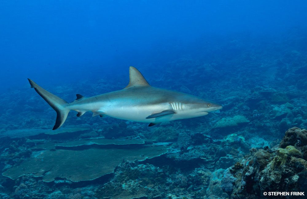 Divers usually drop to 60 feet just north of the channel, which is a good spot for gray reef sharks. The incoming current funnels into the channel and presents a nice opportunity to photograph the sharks against a coral background rather than the deep blue backgrounds at most other wall sites.