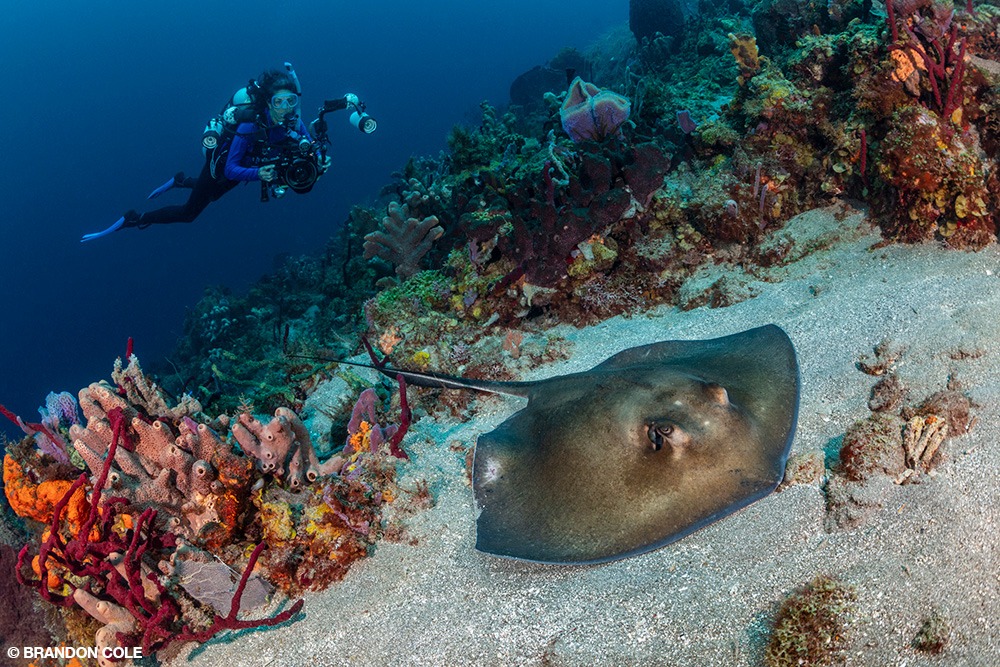 Another highlight of Superman’s Flight was a southern stingray, which I followed and photographed as it descended along the invert-covered incline from 70 to 110 feet (21 to 34 m).