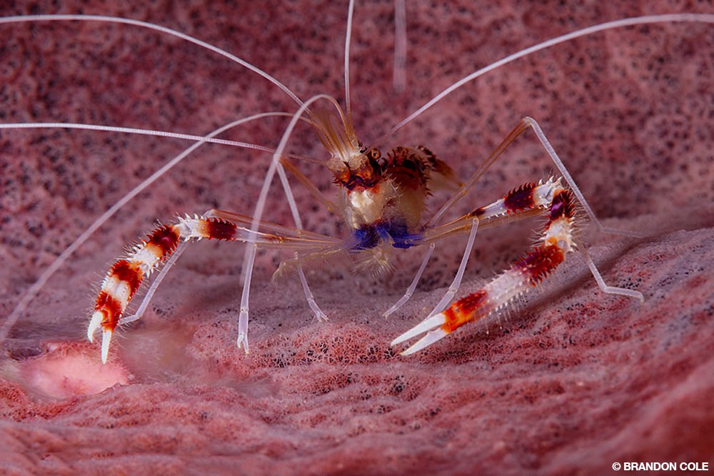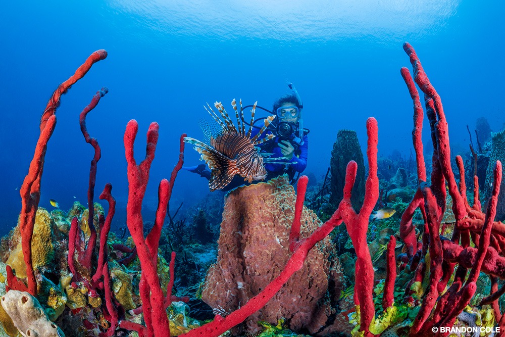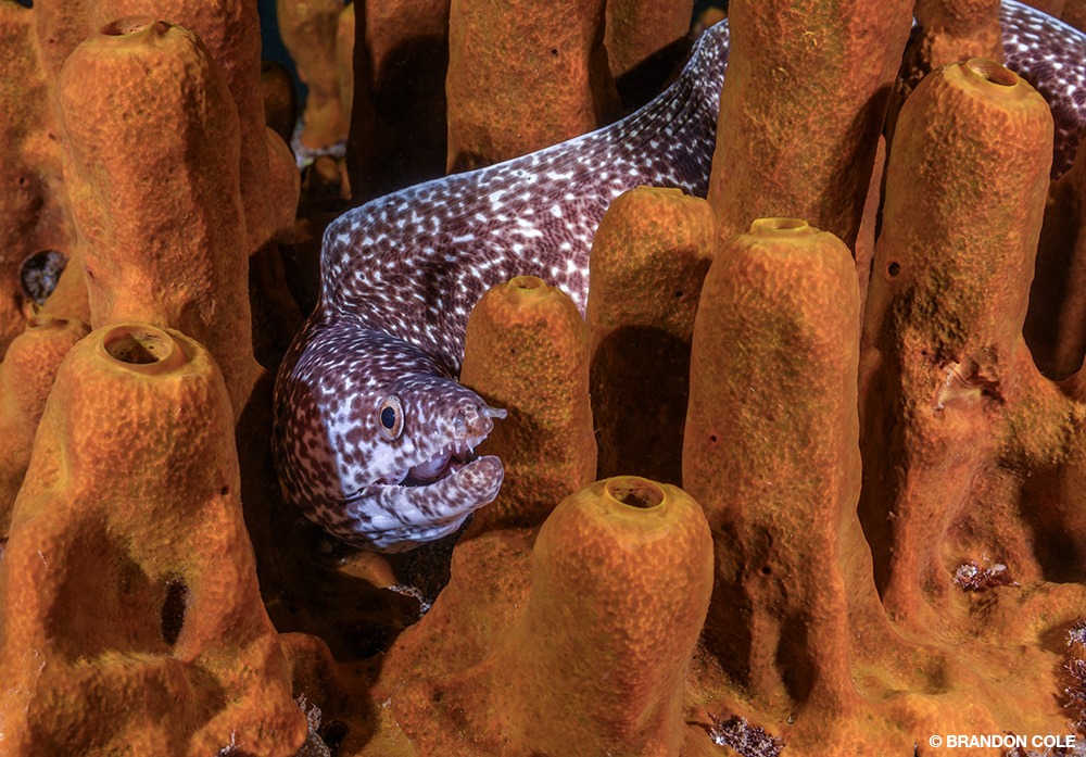 Weaving through the foursome of multistory columnar rocks known as the Pinnacles, we became acquainted with a few nosy morays. They were bold and curious because divers regularly cull tasty lionfish here. Stunning magenta and orange royal grammas hovered upside down under overhangs. There were Pederson shrimp in corkscrew anemones, banded cleaner shrimp in vase sponges, and camouflaged scorpionfish in plain view. All these critters were sights to behold.