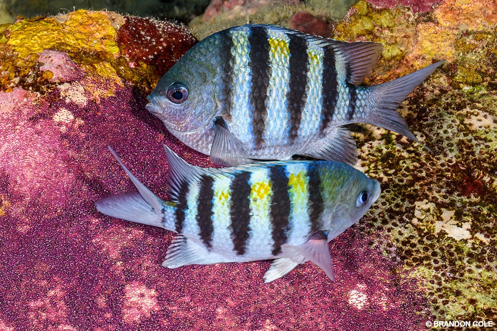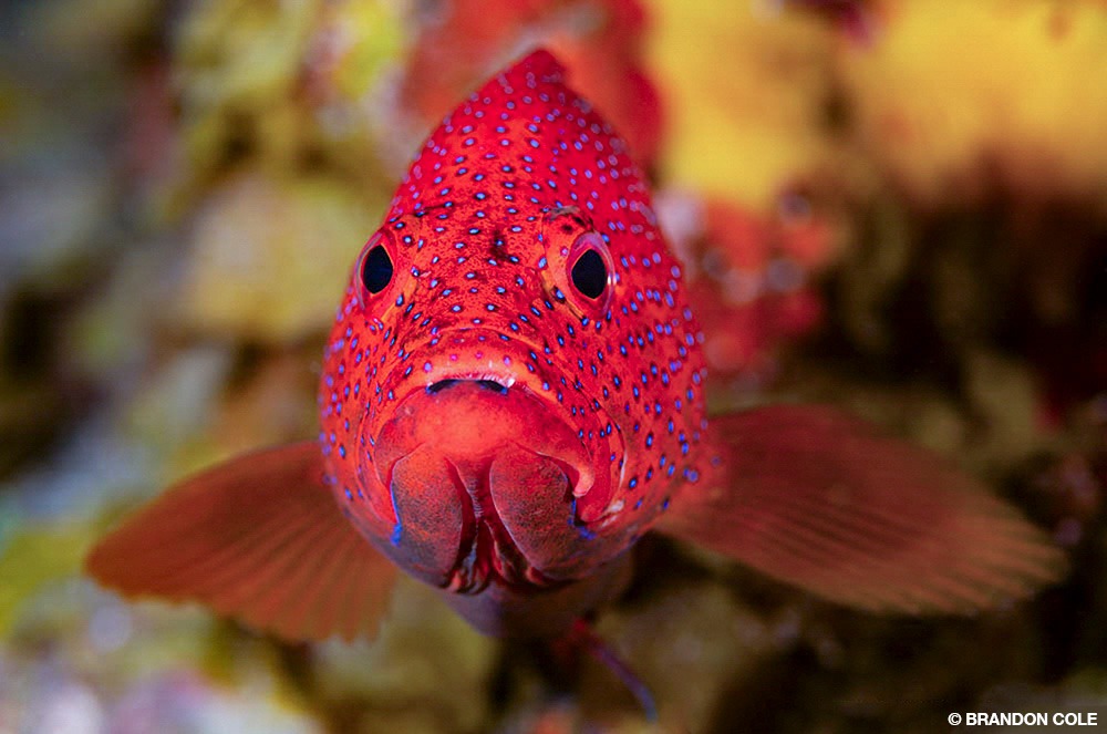 Nitrox extended our no-decompression limits, allowing us to comfortably cruise between 60 and 80 feet (18 and 24 meters) for most of our bottom time. This depth range seemed to be the sweet spot for fishiness combined with maximum colorful invertebrate cover, but divers shouldn’t miss the shallow plateau above. Huge boulders create a playground for enjoyable exploration while offgassing. We saw schools of silver chubs, sergeant majors tending clutches of mauve eggs, and photogenic formations of mustardy tube sponges.