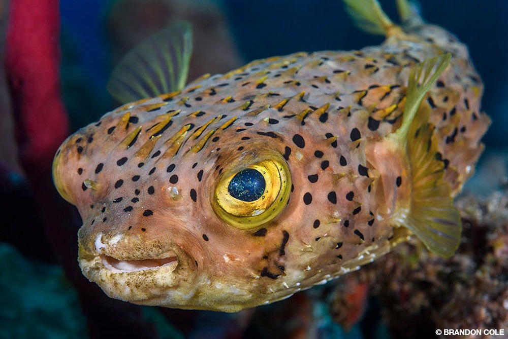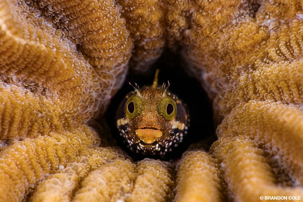 The simplest of shore entries gives access to our resort’s House Reef. Popular day and night with newbies and old salts alike, this site proved a gold mine for camera-worthy critters. Things started with a bang in only 5 feet (1.5 m) of water with a bug-eyed secretary blenny, whose home base was a hole in small brain coral. Juvenile spotted drums rehearsed their hypnotic, sashaying swimming style back and forth on a ledge at 20 feet (6 m).