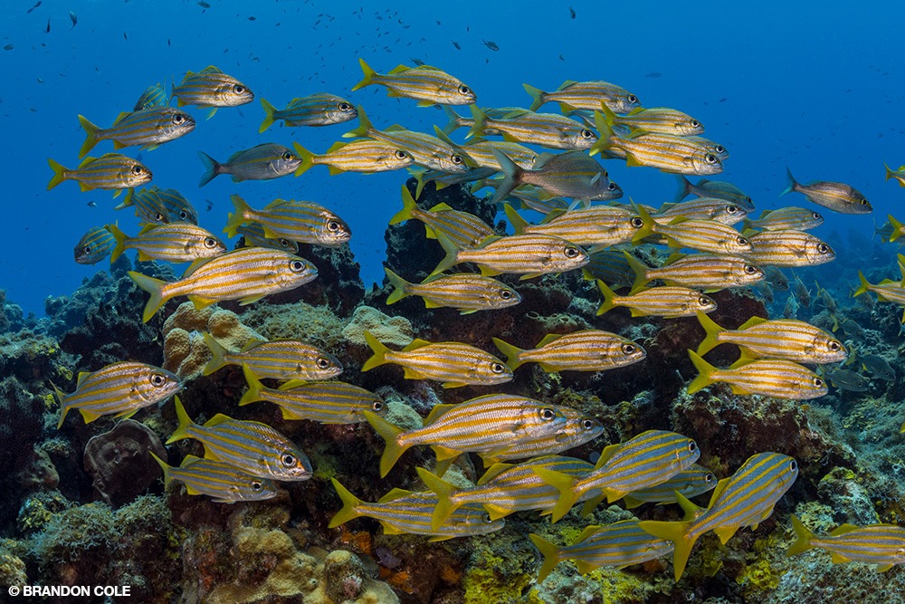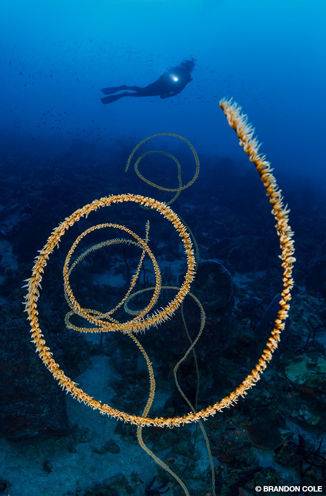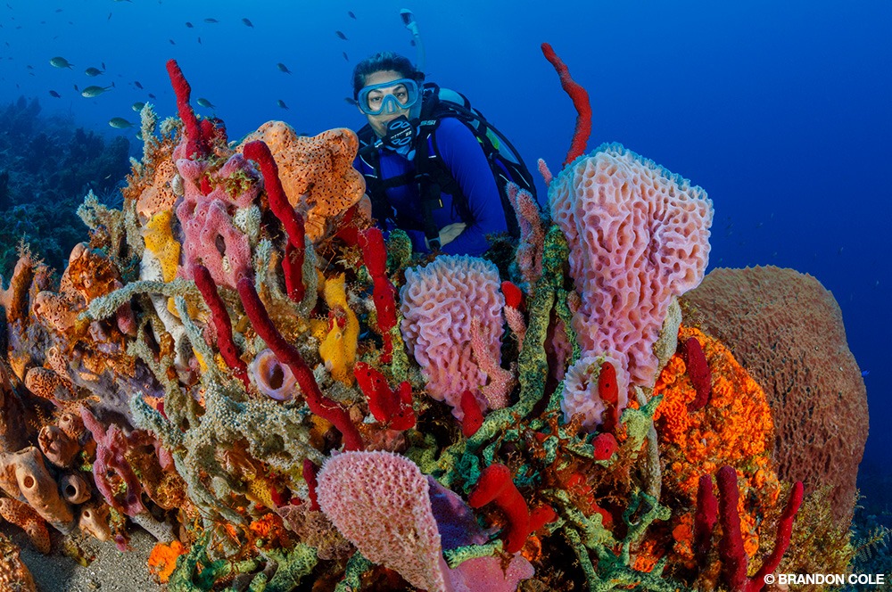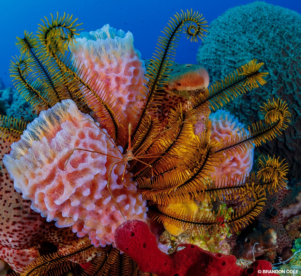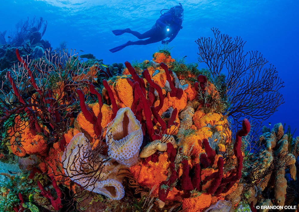 We found baitfish, chromis, grunts, soldierfish, and squirrelfish streaming over and sheltering amid sea fans, feather stars, and a diverse mix of sponges. In addition to the usual five-alarm-blaze species in brilliant scarlet and tangerine, there were large, spiky barrel sponges of ruddy complexion, exquisitely textured azure vase sponges shining in pearlescent pink, nubbly mats of canary yellow boring sponge, and tan tube sponges shaped like curved flutes.