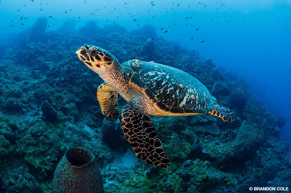 A school of about a hundred horse-eye jacks flashing in open water over my shoulder pulled me off the slope, but I would have missed the passing hawksbill turtle had my wife, Melissa, not redirected my photographic focus back to the reef. Thank you, buddy dearest.