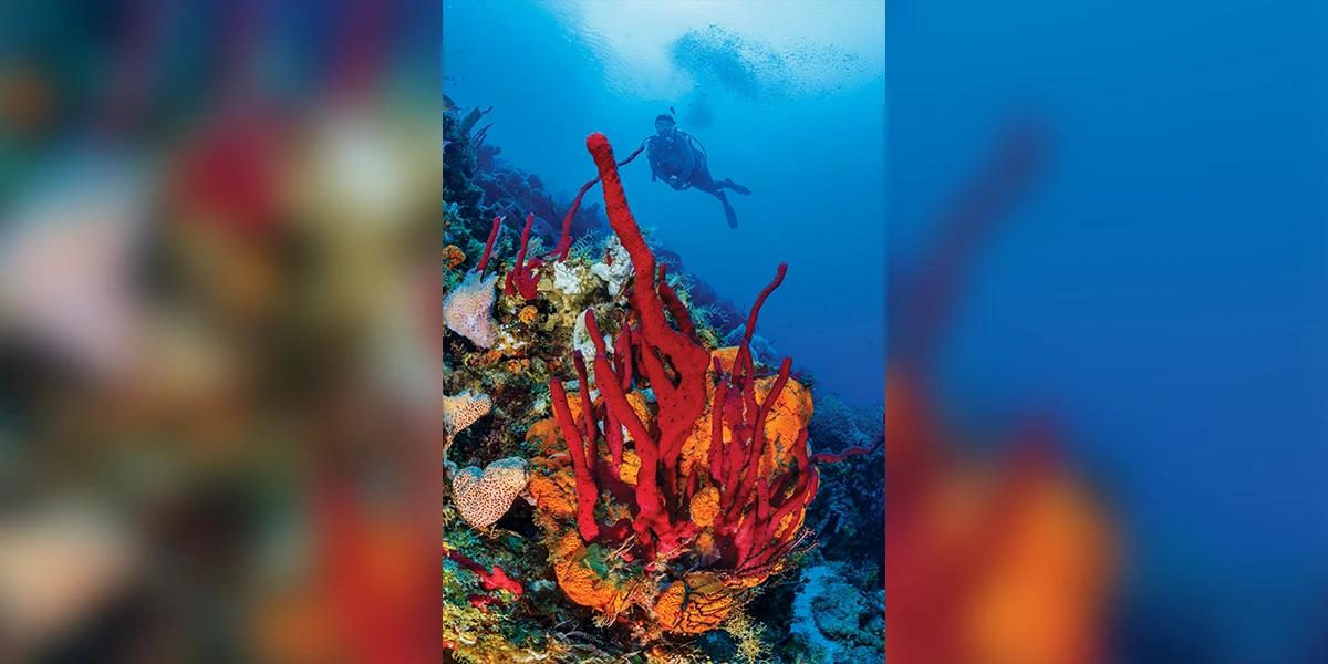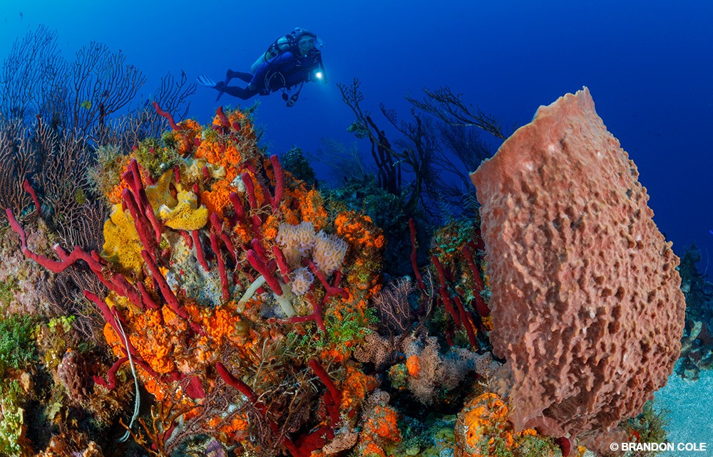 Red erect rope sponges (Amphimedon compressa) and orange elephant ear sponge (Agelas clathrodes) decorate a current-swept reef slope at about 70 feet (21 meters) deep.