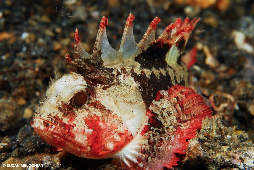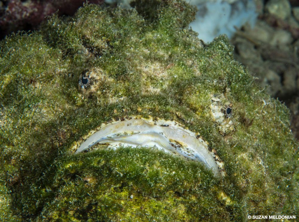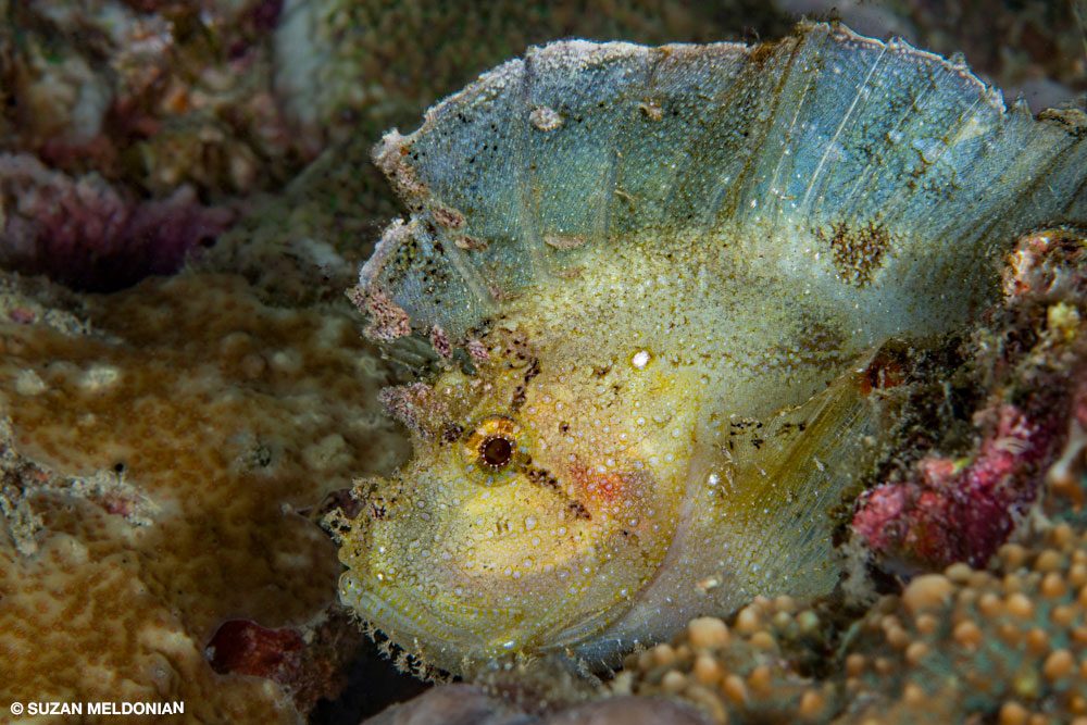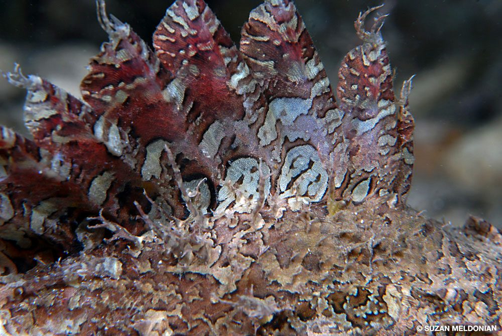The spiny devilfish (Inimicus didactylus) is a member of the family Scorpaenidae, which also contains the venomous lionfish, stonefish, and scorpionfish. These fish conceal glandular venom-producing daggers within their dorsal, pelvic, and anal fins. Divers — especially underwater photographers who may focus on one creature while others sidle up under their legs — must be aware of these animals’ subtle defense maneuvers.