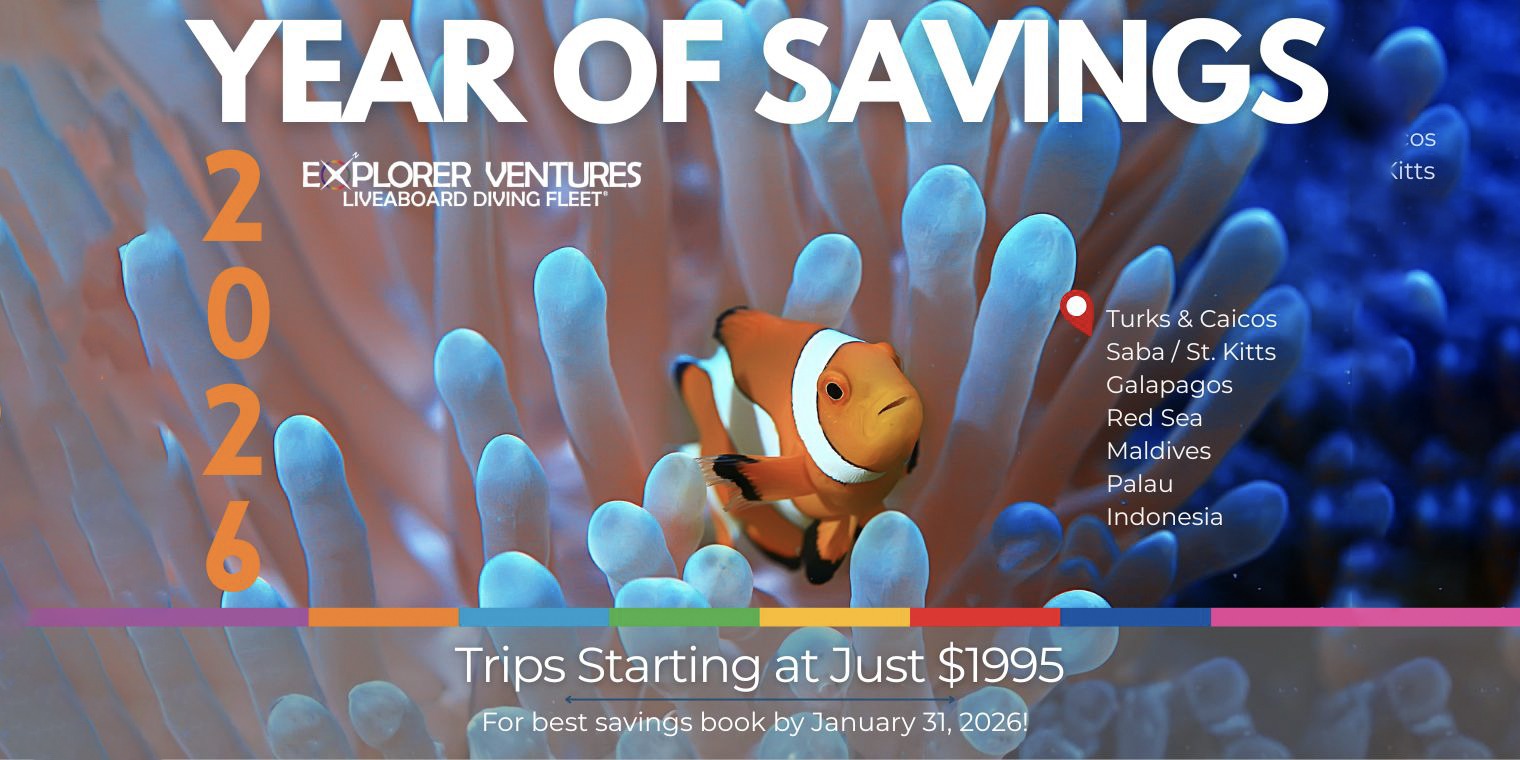 Explorer Ventures Liveaboard Fleet has launched its popular Year of Savings 2026, offering early booking discounts on select liveaboard departures across the fleet for travel throughout 2026. Until January 31, guests can save up to $1100 per person, with select trips starting at only $1995 per person.