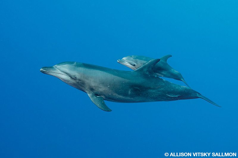 I shake my head and descend toward the wall, where a large eagle ray is lazily circling. As I start adjusting my camera settings in the hopes of a close pass, I hear a bell ringing insistently — a signal from our dive guide that he finally sees dolphins approaching. I kick as hard as I can until I finally see a group of six (including an adorable baby) swimming unhurriedly but with purpose, checking us out as they continue toward their destination. I manage to capture a few “proof” images, and then I put down my camera, assuming the moment is over.