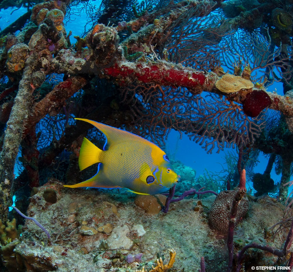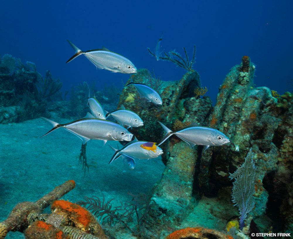 Purple tube sponges as well as other barrel and encrusting sponges of fantastic color now cloak the wreck. Angelfish commonly flit about, nibbling on sponges, and a resident school of horse-eye jacks is often in the midwater background.