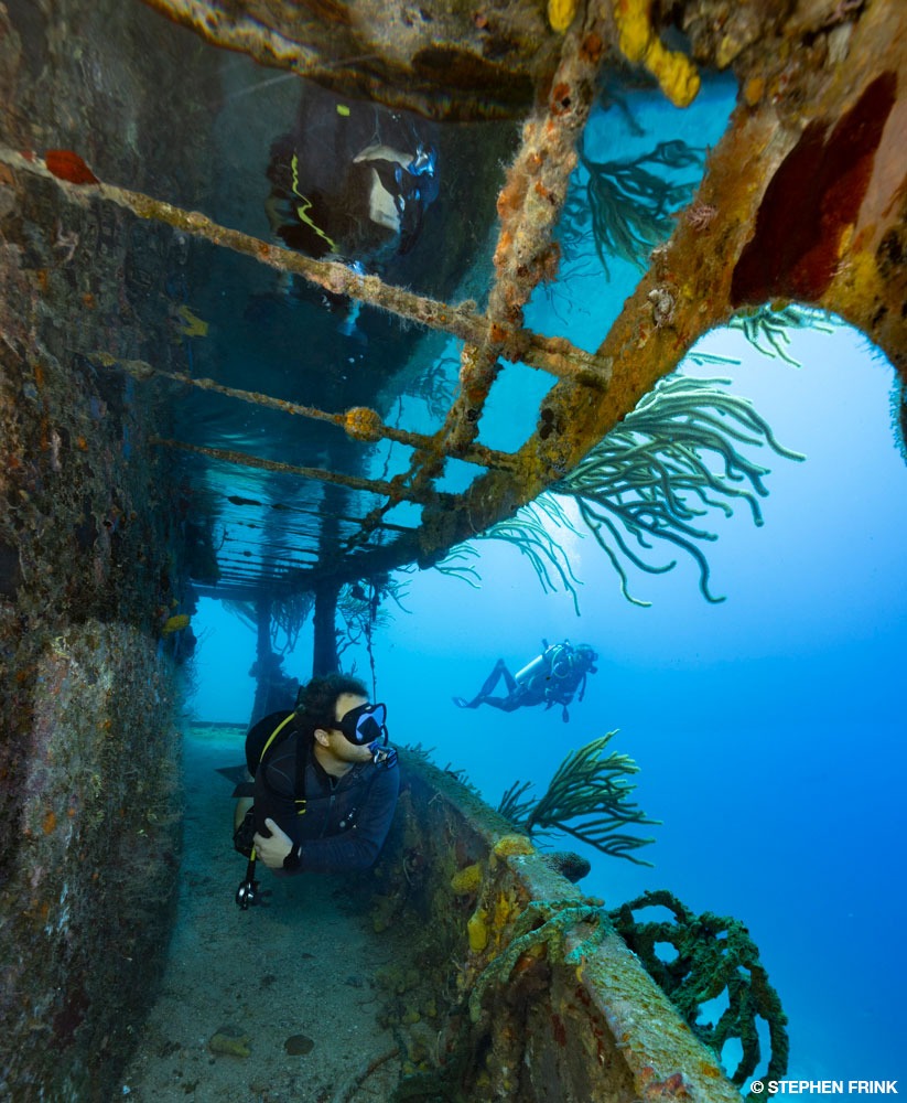 For wide-angle enthusiasts, there are always the colorful strobe-lit foregrounds with shark silhouettes in the distance. The sponges are quite mature on this wreck, so color abounds everywhere. The companionway ceilings hold exhalation bubbles from thousands of passing divers, and a clever camera angle can reveal reflections of your dive buddy in the mirrorlike surface. While the holds amidship tend not to be very interesting, both the bow and stern are excellent. This is another relatively shallow wreck, so you will have ample time and light.
