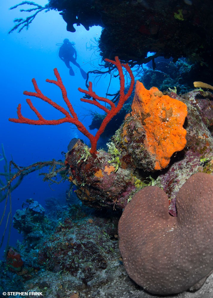 Deeper drop-offs such as Razorback Wall and Shark Wall are where you will likely find huge orange elephant ear sponges. It is also where the indigo water from the TOGO is startling in contrast to the vibrant red rope and azure vase sponges that punctuate the edge of the precipice. Large angelfish and schools of horse-eye jacks are common, and an impressive school of Atlantic spadefish occasionally appears in the midwater depths.